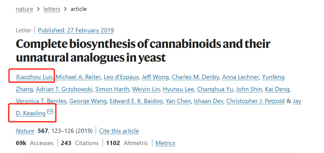 2019 年,羅小舟博士與其導(dǎo)師 Jay D. Keasling 院士合作,成功打通大麻素的生物全合成通路,相關(guān)研究成果發(fā)表在了學(xué)術(shù)期刊 Nature 上,成為合成生物研究的一個(gè)典型案例。在之后,團(tuán)隊(duì)還進(jìn)一步實(shí)現(xiàn)了大麻素的產(chǎn)業(yè)化轉(zhuǎn)化。