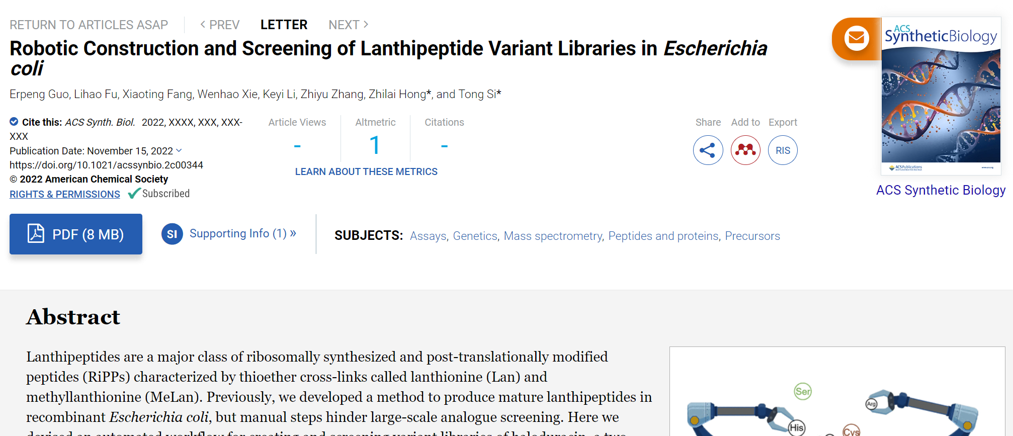 ACS Synthetic Biology | 深圳先進(jìn)院合成所司同課題組對羊毛硫肽衍生物文庫的自動(dòng)化構(gòu)建和篩選