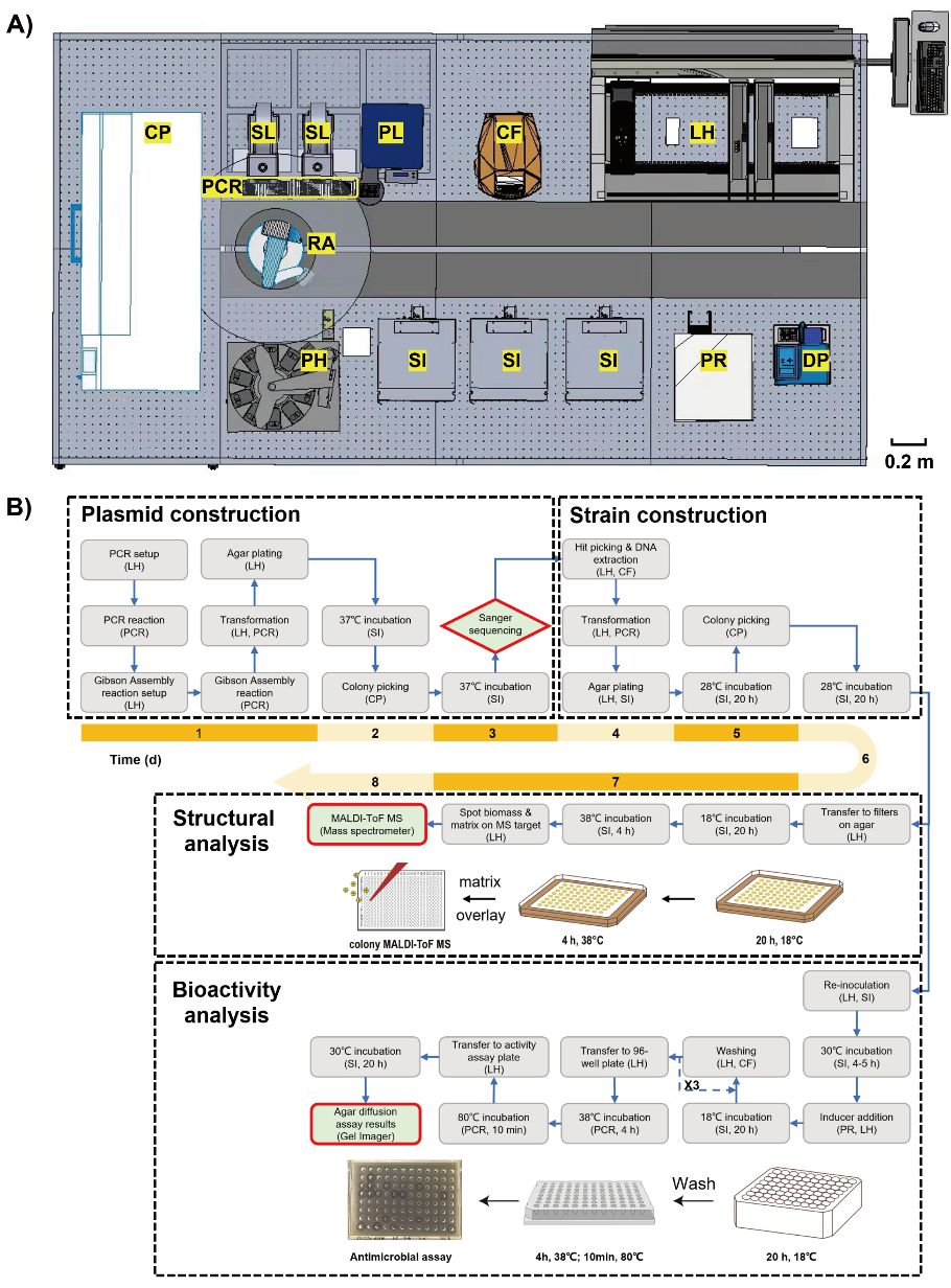 圖1:A)自動(dòng)化功能島布局,B)羊毛硫肽突變文庫自動(dòng)化構(gòu)建和篩選流程