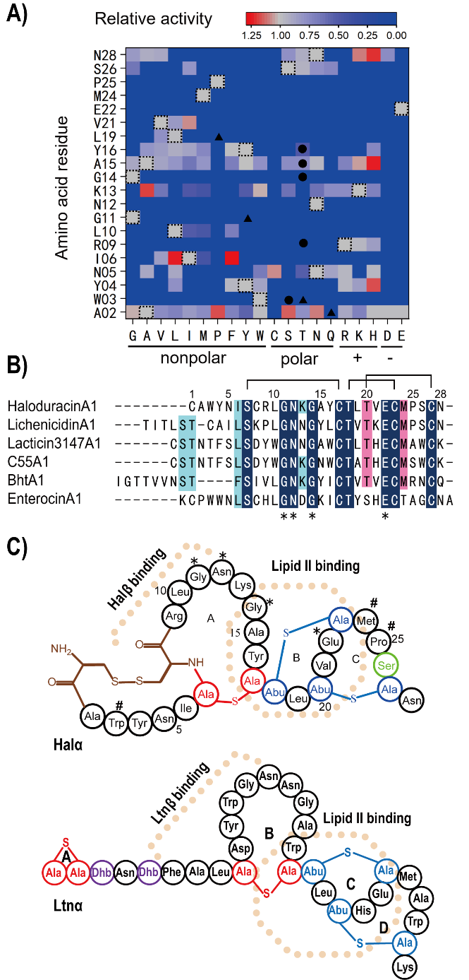 首先,作者驗(yàn)證了基于大腸桿菌自裂解系統(tǒng)能夠在96孔板中產(chǎn)生成熟的haloduracin α多肽。隨后,基于“大設(shè)施”的自動(dòng)化平臺,作者針對不參與成環(huán)的殘基在前體基因中引入NNK簡并密碼子,成功構(gòu)建定點(diǎn)飽和突變文庫(Site-saturation mutagenesis,SSM)并獲得了全部380個(gè)突變株。作者基于瓊脂抑菌實(shí)驗(yàn),快速獲得了序列-活性數(shù)據(jù),并結(jié)合進(jìn)化分析、文獻(xiàn)報(bào)道分析了關(guān)鍵位點(diǎn)和突變(圖2)。根據(jù)瓊脂抑菌篩選結(jié)果,作者挑選了表觀活性優(yōu)于野生型的衍生物分子進(jìn)行搖瓶發(fā)酵和分離純化,但并未觀察到比活(specific activity)指標(biāo)的提升,表明基于細(xì)胞裂解液和瓊脂抑菌圈的篩選方法具有局限,推測結(jié)果可能被多種因素影響(如翻譯后修飾、產(chǎn)量、瓊脂中的穩(wěn)定性和擴(kuò)散能力等)?;谧詣?dòng)化平臺,作者進(jìn)一步開展了MALDI-TOF質(zhì)譜鑒定和GFP融合表達(dá)分析,對衍生物的結(jié)構(gòu)和產(chǎn)量進(jìn)行分析。