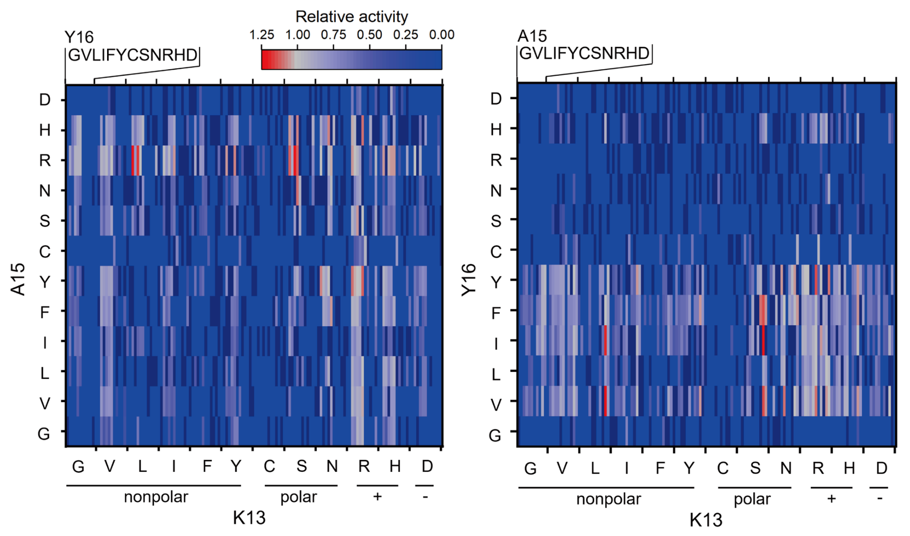 隨后,作者進(jìn)一步選擇A環(huán)中Lys13、Ala15和Tyr16進(jìn)行組合突變,這些位點(diǎn)對氨基酸突變具有高耐受性,且在同源序列中具有進(jìn)化多樣性。作者使用編碼12種氨基酸的NDT簡并密碼子構(gòu)建組合突變文庫,通過DNA測序從4800個(gè)隨機(jī)菌落中篩選得到1373個(gè)獨(dú)特的三位點(diǎn)突變株(占理論文庫容量12 × 12 × 12 = 1728的79.4%),通過瓊脂抑菌實(shí)驗(yàn)獲得序列功能關(guān)系(圖3),并最終篩選得到Lys13Val-Ala15Arg組合突變可以顯著降低對L. lactis指示菌的最小抑菌濃度。