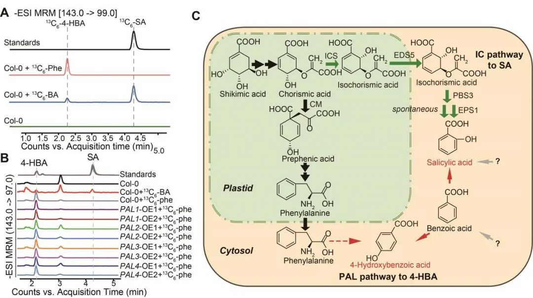 (A)苯丙氨酸合成SA的同分異構(gòu)體4-HBA;(B)PAL內(nèi)源活性增強不影響[13C6]-SA的合成;(C)IC途徑合成SA,PAL途徑合成SA的同分異構(gòu)體4-HBA