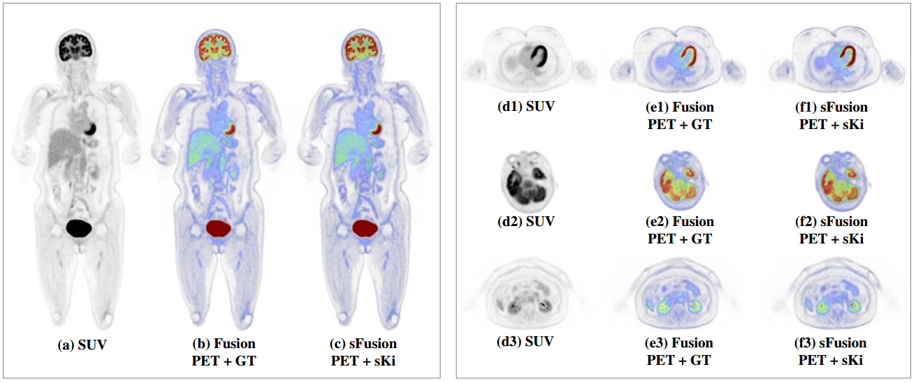 進(jìn)一步,為了更大的降低動態(tài)PET掃描時(shí)間并提高病人舒適度,團(tuán)隊(duì)與臨床醫(yī)院合作開展了動態(tài)PET參數(shù)圖像生成的前瞻性臨床研究,基于靜態(tài)PET的SUV圖像通過網(wǎng)絡(luò)學(xué)習(xí)來合成得到動態(tài)PET的Ki圖像。采用深度學(xué)習(xí)完成動態(tài)PET參數(shù)圖像的直接生成,避免了血液輸入函數(shù)的計(jì)算過程。深度學(xué)習(xí)技術(shù)具有良好的特征提取和非線性擬合能力,可以用來構(gòu)造不同數(shù)據(jù)分布模型之間的映射關(guān)系。實(shí)驗(yàn)采集了200例病人數(shù)據(jù),定量評估指標(biāo)包括峰值信噪比、結(jié)構(gòu)相似性指數(shù)測量和歸一化均方誤差,同時(shí)也采用臨床醫(yī)生的主觀評分作為評判并采用10折的交叉驗(yàn)證來評估動態(tài)PET參數(shù)圖像的生成結(jié)果。實(shí)驗(yàn)結(jié)果揭示了深度學(xué)習(xí)技術(shù)可以有效輸出高質(zhì)量的合成參數(shù)圖像,未來我們將進(jìn)一步驗(yàn)證和提高網(wǎng)絡(luò)學(xué)習(xí)模型的可解釋性(圖2)。相關(guān)研究工作以“Parametric image generation with the uEXPLORER total-body PET/CT system through deep learning”為題發(fā)表于核醫(yī)學(xué)領(lǐng)域頂刊European Journal of Nuclear Medicine and Molecular Imaging(49: 2482-2492,2022),博士后黃振興為論文第一作者。