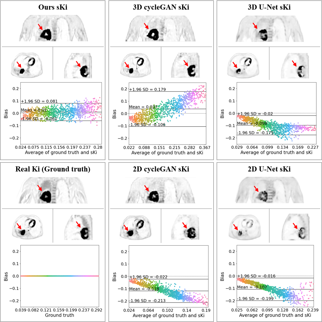 進(jìn)一步,為了解決特定部位、特定病種和病人的個(gè)性化分析問題,團(tuán)隊(duì)與臨床醫(yī)院合作實(shí)現(xiàn)了半監(jiān)督學(xué)習(xí)的動態(tài)PET三維參數(shù)圖像生成的臨床前瞻性研究。實(shí)現(xiàn)了基于3D生成對抗網(wǎng)絡(luò)的半監(jiān)督學(xué)習(xí)模型,降低了訓(xùn)練數(shù)據(jù)標(biāo)簽的嚴(yán)格配對要求。我們采用改進(jìn)的循環(huán)生成對抗網(wǎng)絡(luò)來學(xué)習(xí)靜態(tài)PET與Ki參數(shù)圖像之間的映射關(guān)系,通過增強(qiáng)切片間和切片內(nèi)的注意力來提高圖像質(zhì)量和量化精度。網(wǎng)絡(luò)生成的Ki圖像可以為臨床醫(yī)生提供額外的定量參考,獲得更好的診斷指導(dǎo),而無需實(shí)際的動態(tài)掃描。為了進(jìn)一步定量分析合成的Ki圖像與參考圖像之間的一致性,我們從測試數(shù)據(jù)中選取了一位患有肺部惡性腫瘤的受試者,描繪并分析了其腫瘤的感興趣區(qū)域(圖4)。提出方法獲得的合成 Ki圖像與真實(shí)Ki圖像之間的95%一致性限制范圍為- 0.061到0.081(平均值為0.01)。而傳統(tǒng)3D U-Net、2D cycleGAN 和2D U-Net算法的合成 Ki圖像均具有較大偏差。相關(guān)研究工作以“Deep learning–based dynamic PET parametric Ki image generation from lung static PET”為題發(fā)表于放射與核醫(yī)學(xué)領(lǐng)域權(quán)威臨床雜志European Radiology(DOI: 10.1007/s00330-022-09237-w),博士生王海燕為論文第一作者。