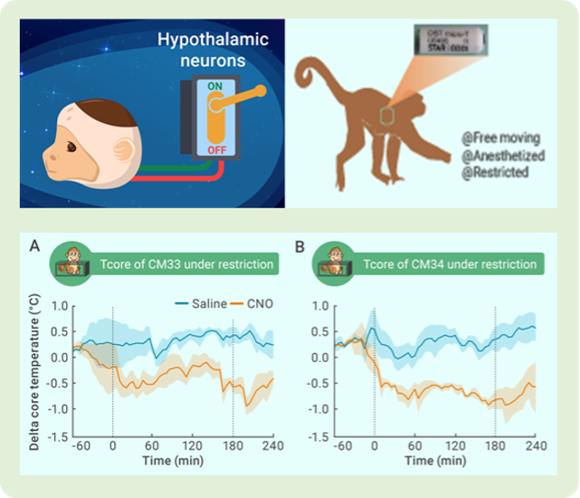 深圳先進(jìn)院腦所王虹和戴輯團(tuán)隊(duì),利用化學(xué)遺傳學(xué)工具,以非人靈長(zhǎng)類動(dòng)物為模型,展開(kāi)神經(jīng)調(diào)控體溫研究。該團(tuán)隊(duì)發(fā)現(xiàn),升高POA腦區(qū)一類進(jìn)化保守的興奮性神經(jīng)元的活性,可以促進(jìn)動(dòng)物降低體溫(如圖2)。