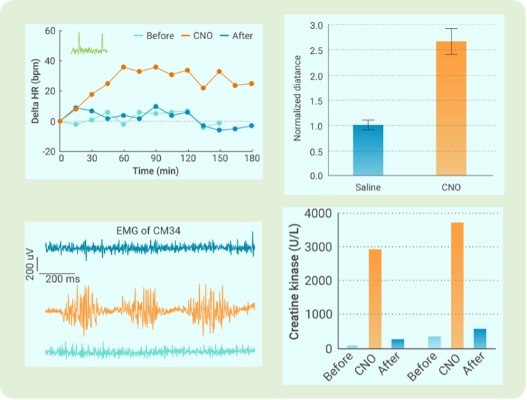 但是與小鼠存在顯著差異的是,非人靈長(zhǎng)類動(dòng)物對(duì)體溫的變化非常敏感。當(dāng)體溫降低約0.5℃的時(shí)候,動(dòng)物已經(jīng)通過(guò)加速心率、肌肉顫栗、收縮外周血管等自主神經(jīng)機(jī)制產(chǎn)熱,拮抗體溫的降低。同時(shí)動(dòng)物大幅增加運(yùn)動(dòng)量,通過(guò)運(yùn)動(dòng)產(chǎn)熱,抵御體溫的降低(圖3)。由此可見(jiàn),非人靈長(zhǎng)類動(dòng)物有著更強(qiáng)的御寒能力,其體溫調(diào)節(jié)機(jī)制較小鼠更加精密復(fù)雜。僅僅是通過(guò)神經(jīng)刺激單一核團(tuán)很難達(dá)到大幅降低體溫的目的。