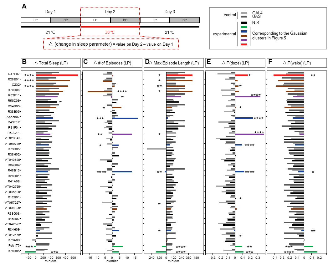 在果蠅中,多種神經(jīng)細(xì)胞類型/環(huán)路參與睡眠總量、結(jié)構(gòu)以及穩(wěn)態(tài)的調(diào)節(jié),但對(duì)橢球體調(diào)控睡眠的理解仍然有限。因橢球體結(jié)構(gòu)及其連接方式的特殊性,鑒定構(gòu)成橢球體的特定亞型細(xì)胞的功能,可以為理解它們?nèi)绾螀f(xié)同調(diào)控睡眠提供突破口。研究團(tuán)隊(duì)利用現(xiàn)有的果蠅品系資源庫(kù),搜集了34個(gè)標(biāo)記橢球體環(huán)狀神經(jīng)元的品系,利用熱遺傳工具dTripA1[19],激活不同類型的橢球體環(huán)狀神經(jīng)元,同時(shí)記錄果蠅的睡眠行為表征,通過分析睡眠總量、覺醒次數(shù)、睡眠片段長(zhǎng)度以及清醒到睡眠(P(doze))、睡眠到清醒(P(wake))的可能性,篩選出對(duì)睡眠總量以及睡眠結(jié)構(gòu)產(chǎn)生影響的橢球體環(huán)狀神經(jīng)元品系(圖1)。結(jié)果可見激活橢球體環(huán)狀神經(jīng)元對(duì)睡眠總量、結(jié)構(gòu)以及穩(wěn)態(tài)產(chǎn)生復(fù)雜的影響。同時(shí),在標(biāo)記果蠅橢球體環(huán)狀神經(jīng)元的品系中表達(dá)綠色熒光蛋白,利用免疫組化的方法,通過解剖學(xué)的分析,鑒定所標(biāo)記的橢球體環(huán)狀神經(jīng)元亞型。