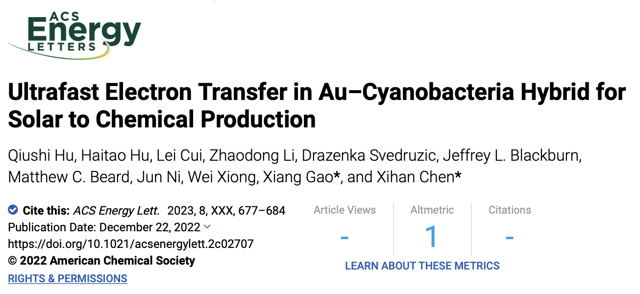 北京時(shí)間12月23日,南方科技大學(xué)機(jī)械與能源工程系陳熹翰課題組與中國(guó)科學(xué)院深圳先進(jìn)技術(shù)研究院合成所材料合成生物學(xué)研究中心高翔課題組在ACS Energy Letters合作發(fā)表題為 “Ultrafast electron transfer in Au–Cyanobacteria Hybrid for Solar to Chemical Production” 的文章。該工作構(gòu)建了金納米顆粒-藍(lán)細(xì)菌雜合體,將光能驅(qū)動(dòng)CO2合成化學(xué)品的效率提高14%。通過(guò)瞬態(tài)吸收光譜直接觀察到金納米顆粒(Au)吸收光能產(chǎn)生的電子,可以直接被藍(lán)細(xì)菌細(xì)胞快速吸收。為解析電子在材料-微生物界面?zhèn)鬟f機(jī)制提供基礎(chǔ)。南方科技大學(xué)博士生胡秋實(shí)、深圳先進(jìn)技術(shù)研究院研究助理胡海濤、博士后崔蕾為文章的共同第一作者。南方科技大學(xué)陳熹翰副教授和深圳先進(jìn)技術(shù)研究院高翔副研究員為文章共同通訊作者。