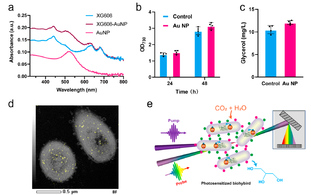 作者首先在藍(lán)細(xì)菌中構(gòu)建了甘油的合成通路,該途徑以卡爾文循環(huán)(CBB)中間代謝物磷酸二羥丙酮(DHAP)為底物,消耗一分子的還原力合成甘油,該工程菌命名為XG608。在光照條件下,成功將CO2固定并轉(zhuǎn)化為甘油。在此基礎(chǔ)上,作者向培養(yǎng)體系中添加金納米顆粒,利用共培養(yǎng)構(gòu)建了金納米顆粒-藍(lán)細(xì)菌的雜合體,通過(guò)吸收光譜分析,觀察到雜合體中同時(shí)具有金納米顆粒和藍(lán)細(xì)菌的特征吸收峰。此外,金納米顆粒在525 nm附近吸收較強(qiáng),與藍(lán)細(xì)菌的吸收光譜性能互補(bǔ),可以潛在提高雜合體的光能捕獲效率。通過(guò)測(cè)試,在光照的條件下,與純藍(lán)細(xì)菌體系相比,雜合體生物量增長(zhǎng)了10%,甘油產(chǎn)量增長(zhǎng)了14.6%。進(jìn)一步通過(guò)掃描透射電子顯微鏡 (STEM) 結(jié)合能譜(EDS) 分析,發(fā)現(xiàn)金納米顆粒分布在藍(lán)細(xì)菌細(xì)胞內(nèi),有利于材料光生電子向微生物細(xì)胞的傳遞。