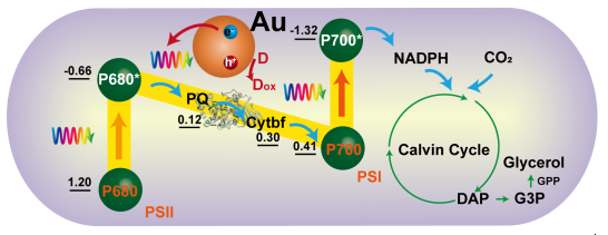 基于以上的研究,作者提出光激發(fā)金納米顆粒提供了額外電子被光合電子傳遞鏈上潛在電子受體接收,進(jìn)入光合電子傳遞鏈,提高光能利用效率,進(jìn)而提高光能驅(qū)動(dòng)CO2固定合成化學(xué)品的效率。