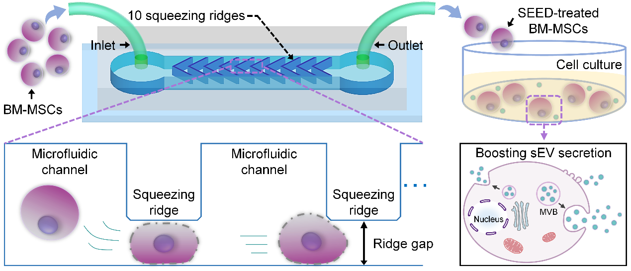 然而在常規(guī)培養(yǎng)條件下,供體細胞往往存在分泌效率有限、外囊泡產(chǎn)量低等技術問題,極大的限制了細胞外囊泡的實際應用。為了提高細胞外囊泡的分泌量,常用的技術手段包括分子調(diào)控、乙醇處理、pH調(diào)節(jié)等生化策略,因依賴于生化試劑添加物,易改變細胞生理狀態(tài)而影響外囊泡的功能性和安全性。為應對這一挑戰(zhàn),楊慧團隊提出一種名為“種子SEED芯片 (Small Extracellular vEsicles Developer)”的微流控編輯平臺,能夠高通量且無損傷的刺激細胞,提高細胞外囊泡的分泌量。