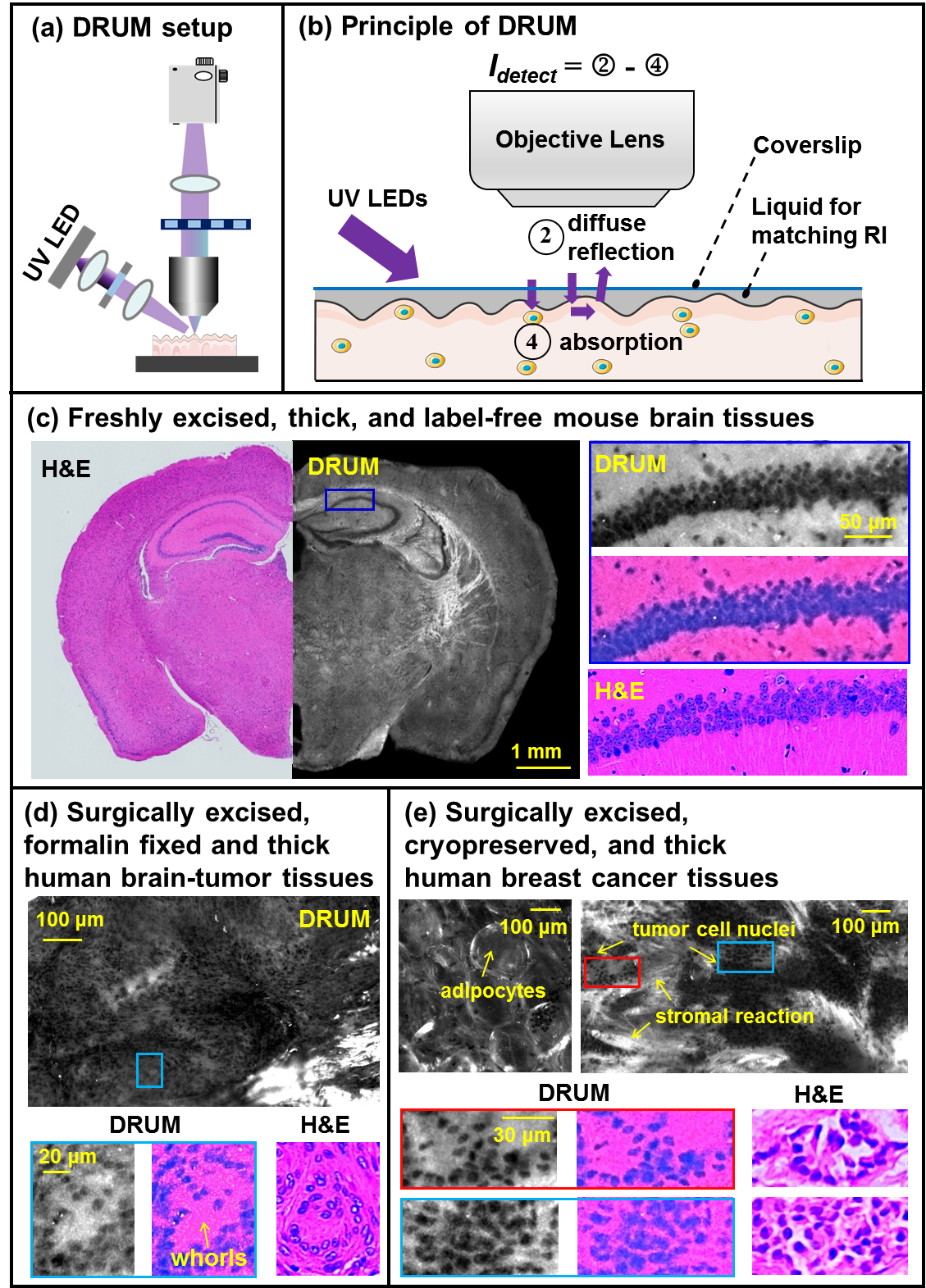 DRUM成像是基于260-nm紫外LED斜照明的寬場成像,在消除鏡面反射和組織散射的基礎(chǔ)上,利用細(xì)胞核吸收紫外光產(chǎn)生的暗信號和細(xì)胞核外組分由于折射率差異而產(chǎn)生的不同強(qiáng)度漫反射信號來提供圖像對比度。因此,DRUM成像技術(shù)不僅能在無需物理切片和染色操作的前提下、在2-3分鐘的周期時間內(nèi)實現(xiàn)厚生物組織的快速成像(目前已知的周期時間最短的病理組織成像方法),而且能以亞細(xì)胞水平分辨率提供包括細(xì)胞核在內(nèi)的多種病理特征信息。