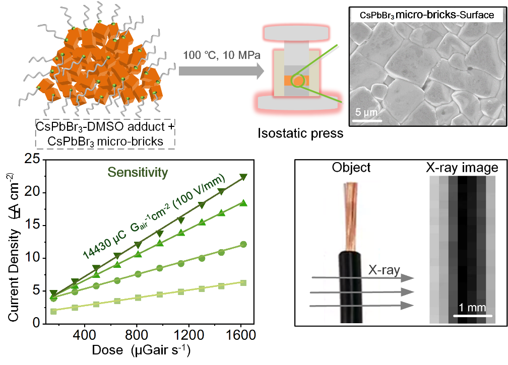 針對上述問題,結(jié)合之前的研究基礎(chǔ),喻學(xué)鋒、劉延亮課題組從提升鈣鈦礦結(jié)晶度、降低鈣鈦礦晶片缺陷密度出發(fā),發(fā)展出用于高性能X射線探測器的全無機(jī)鈣鈦礦晶片。通過機(jī)械研磨法可獲得CsPbBr3粉體,進(jìn)一步在少量DMSO中培養(yǎng)可產(chǎn)出大量具有立方形狀、高結(jié)晶度和優(yōu)良光電性能的CsPbBr3微晶。此外,合成過程中微量的DMSO通過Pb-O鍵結(jié)合到CsPbBr3微磚表面形成CsPbBr3-DMSO絡(luò)合物。在熱壓加工過程中,絡(luò)合物釋放的DMSO蒸汽不僅可以促進(jìn)CsPbBr3晶粒生長,還能在100 ℃的低溫下促進(jìn)CsPbBr3微磚融合成致密的晶片,從而提高電荷傳輸性能,獲得高效鈣鈦礦直接X射線探測器,靈敏度可達(dá)14,430 μC Gyair –1 cm–2,檢出限為564 nGyair s–1,具有良好的工作穩(wěn)定性。