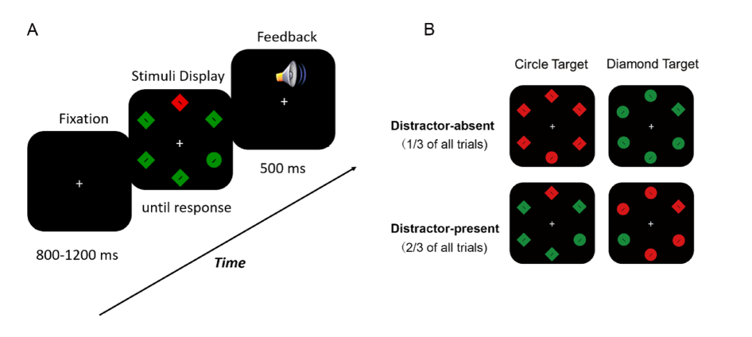 在該研究中,研究人員利用高時間分辨率腦電技術(shù)結(jié)合特定設(shè)計(jì)的視覺搜索范式,用以區(qū)分注意的不同階段,有利于厘清焦慮相關(guān)的注意損傷機(jī)制。研究人員隨機(jī)招募66名健康受試者,并通過量表測量他們的特質(zhì)焦慮水平(長期的焦慮傾向)和狀態(tài)焦慮水平(當(dāng)前的焦慮程度)。在實(shí)驗(yàn)中,科研人員采用了中性幾何刺激的視覺搜索任務(wù)(見圖1),讓受試者在一圈幾何圖形中搜索一個形狀不同的目標(biāo)(例如菱形中的圓形),并盡量忽視可能出現(xiàn)的顏色干擾,同時用高時空分辨率的128通道的腦電設(shè)備來記錄受試者的腦電信號。