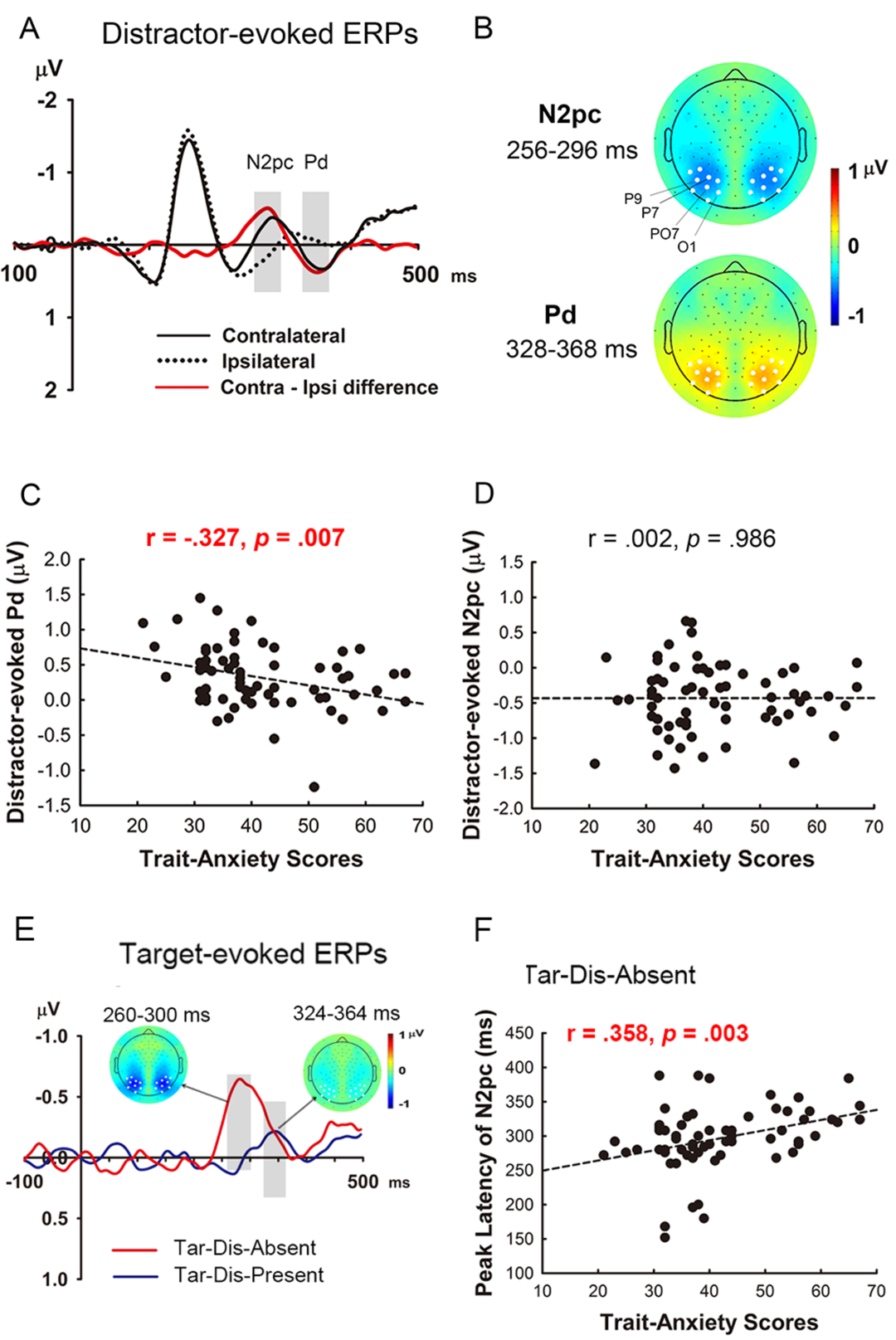 在腦電信號中,N2pc成分表征大腦的注意選擇功能,Pd成分表征大腦的注意抑制功能。研究發(fā)現(xiàn),在目標(biāo)搜索過程中,個體先被干擾刺激捕獲注意,誘發(fā)N2pc成分,然后對干擾刺激進(jìn)行主動抑制,誘發(fā)Pd成分(圖2 A和B)。進(jìn)一步分析發(fā)現(xiàn),個體的特質(zhì)焦慮水平越高,注意抑制能力越差(Pd振幅減小,圖2C),對目標(biāo)的注意選擇也越晚(N2pc潛伏期延后,圖2E-F)。與特質(zhì)焦慮不同,個體的當(dāng)前的焦慮水平與注意功能沒有顯著的相關(guān)性。