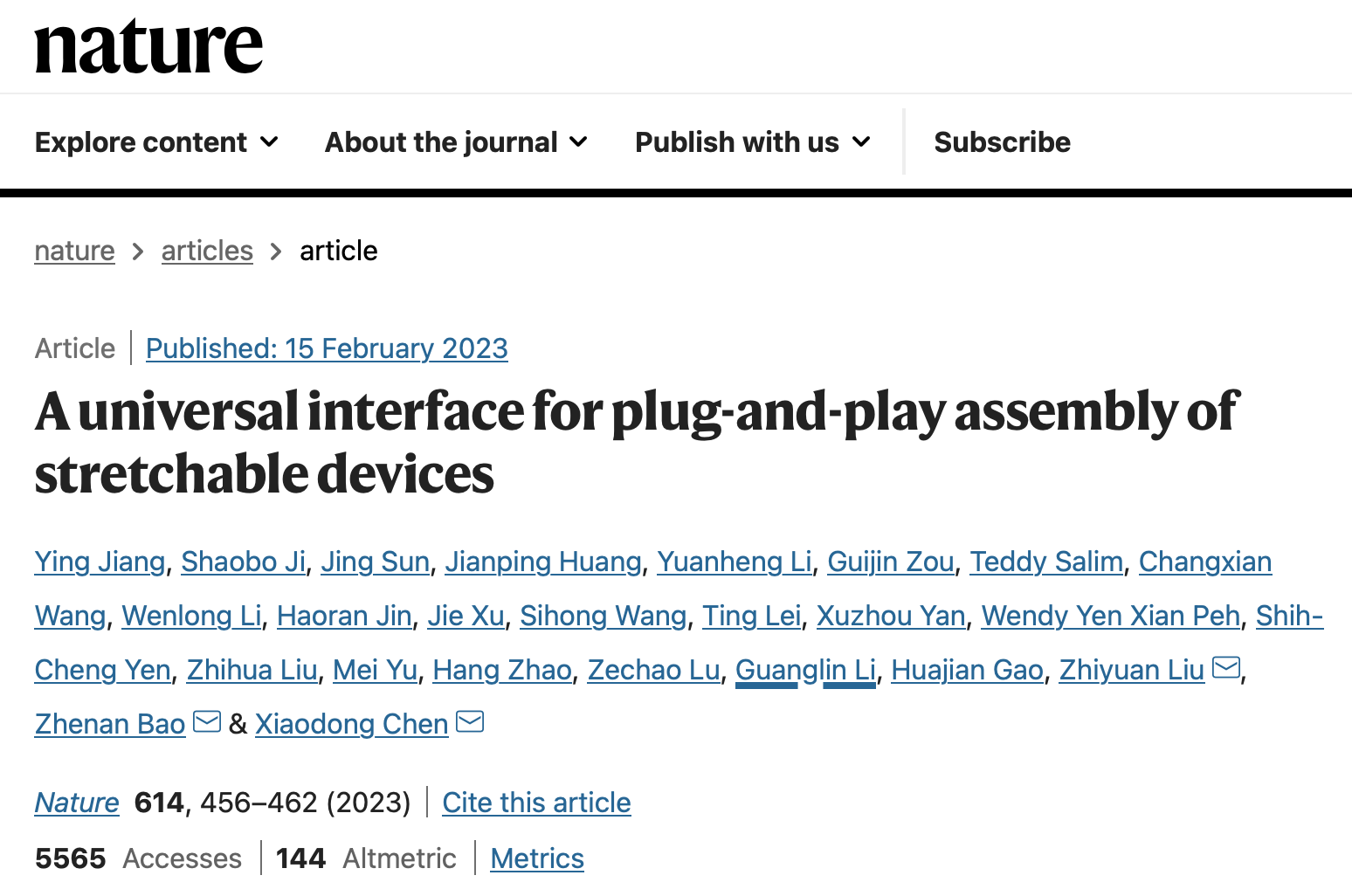 相關(guān)成果于2月15日發(fā)表在國際頂級(jí)期刊Nature上。深圳先進(jìn)院研究員劉志遠(yuǎn)南洋理工大學(xué)教授陳曉東、斯坦福大學(xué)教授鮑哲南為論文共同通訊作者,南洋理工大學(xué)博士姜穎為第一作者。
