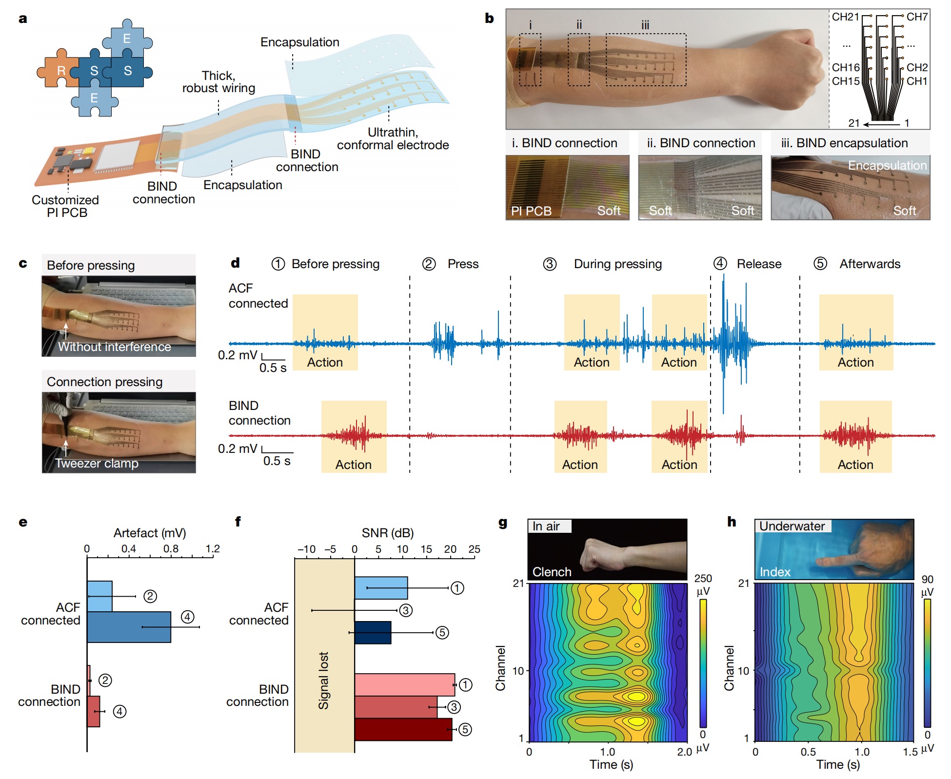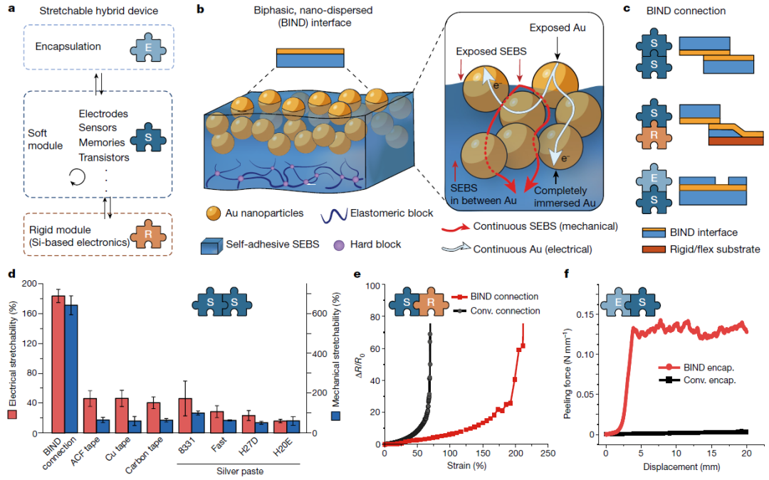 聯(lián)合團(tuán)隊(duì)發(fā)現(xiàn),在特定的制備條件下,基于SEBS嵌段聚合物和黃金納米顆粒的柔性界面,即BIND界面,面對(duì)面貼合時(shí)有“魔術(shù)貼”式的電氣與機(jī)械雙重黏合特性,能夠?qū)⒉煌δ艿娜嵝詡鞲衅鞣€(wěn)定地黏合在一起,從而實(shí)現(xiàn)柔性模塊與柔性模塊之間的高效連接。通過熱蒸發(fā)金(Au)或銀(Ag)納米顆粒制備BIND界面,在自粘苯乙烯-乙烯-丁烯-苯乙烯(SEBS)熱塑性彈性體內(nèi)部形成互穿納米結(jié)構(gòu),SEBS是一種廣泛應(yīng)用于可拉伸電子產(chǎn)品的軟基板。SEBS基質(zhì)表面附近的納米顆粒形成了一個(gè)雙相層(大約90納米深),其中一些納米顆粒完全浸入其中,而另一些納米顆粒部分暴露在外。這種界面結(jié)構(gòu)在表面產(chǎn)生了暴露的SEBS和Au,在基體內(nèi)部產(chǎn)生了互穿的Au納米顆粒,這為堅(jiān)固的BIND連接提供了連續(xù)的機(jī)械和電氣途徑??傊@種即插即用的接口可以簡(jiǎn)化和加速皮膚上和可植入的可拉伸設(shè)備的開發(fā)。實(shí)驗(yàn)表明,采用新型接口的柔性醫(yī)療器件能高精度、高保真、抗干擾地監(jiān)測(cè)體內(nèi)外不同器官,包括表皮、腦皮層、坐骨神經(jīng)、腓骨肌肉、膀胱等,比起商用導(dǎo)電膠組裝的系統(tǒng)信號(hào)質(zhì)量大幅度提升。
