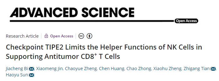 2月19日,Advanced Science 雜志在線發(fā)表了田志剛院士團(tuán)隊的最新研究成果“Checkpoint TIPE2 limits the helper functions of NK cells in supporting antitumor CD8+ T cells”,報道了NK細(xì)胞輔助CD8+ T細(xì)胞抗腫瘤免疫應(yīng)答的分子機制,并報道了TIPE2分子是NK細(xì)胞輔助功能的卡控點分子,靶向敲除NK細(xì)胞中TIPE2能同時促進(jìn)NK細(xì)胞及其輔助的CD8+ T細(xì)胞抗腫瘤應(yīng)答。中國科學(xué)技術(shù)大學(xué)田志剛教授、孫昊昱教授及中國科學(xué)院深圳先進(jìn)技術(shù)研究院合成生物學(xué)研究所畢嘉成副研究員為該文的通訊作者,畢嘉成副研究員同時為該文的第一作者。