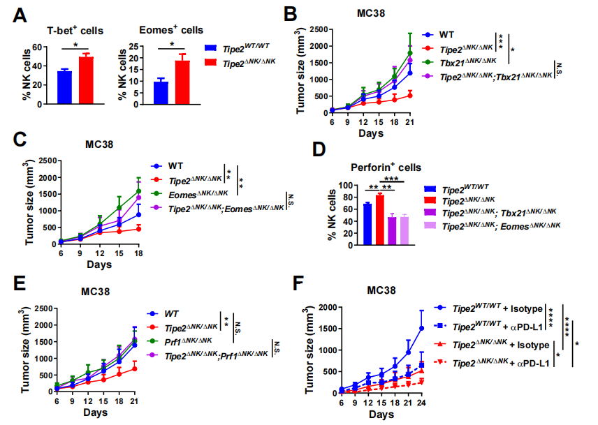 在作用機制方面,由于科研人員觀察到腫瘤浸潤NK細(xì)胞中效應(yīng)分子IFN-g及perforin表達(dá)較高的群體Tipe2表達(dá)較低,且Tipe2缺失的腫瘤浸潤NK細(xì)胞具有更強的殺傷活性(圖2),科研團(tuán)隊考慮TIPE2是否通過抑制IFN-g及perforin等效應(yīng)分子的上游分子,間接抑制NK細(xì)胞的效應(yīng)功能,從而影響CD8+T細(xì)胞抗腫瘤應(yīng)答。團(tuán)隊發(fā)現(xiàn)Tipe2缺失后腫瘤浸潤NK細(xì)胞表達(dá)更高水平的轉(zhuǎn)錄因子T-bet及Eomes。轉(zhuǎn)錄因子T-bet和Eomes促進(jìn)NK細(xì)胞一系列效應(yīng)分子的轉(zhuǎn)錄,對NK細(xì)胞的效應(yīng)功能起關(guān)鍵作用。另一方面,科研團(tuán)隊檢測到Tipe2缺失后腫瘤浸潤NK細(xì)胞也表達(dá)更高水平的perforin,且該現(xiàn)象依賴T-bet或Eomes的存在,印證了T-bet/Eomes與NK細(xì)胞效應(yīng)功能之間的緊密聯(lián)系。重要的是,團(tuán)隊發(fā)現(xiàn)NK細(xì)胞中Tipe2缺失對腫瘤生長的抑制效應(yīng)依賴于NK細(xì)胞中表達(dá)T-bet、Eomes及perforin,這三者之中任意其一若同時缺失的話,腫瘤將恢復(fù)加速生長。另一方面,NK細(xì)胞Tipe2缺失能夠進(jìn)一步促進(jìn)抗PD-L1治療的抗腫瘤效應(yīng),提示二者的作用機制之間存在協(xié)同效應(yīng)(圖3)??蒲袌F(tuán)隊的研究表明NK細(xì)胞TIPE2通過抑制轉(zhuǎn)錄因子T-bet和Eomes及其下游的效應(yīng)分子的表達(dá),間接限制了抗腫瘤CD8+ T細(xì)胞的功能,提示TIPE2是NK細(xì)胞輔助功能的卡控點分子。