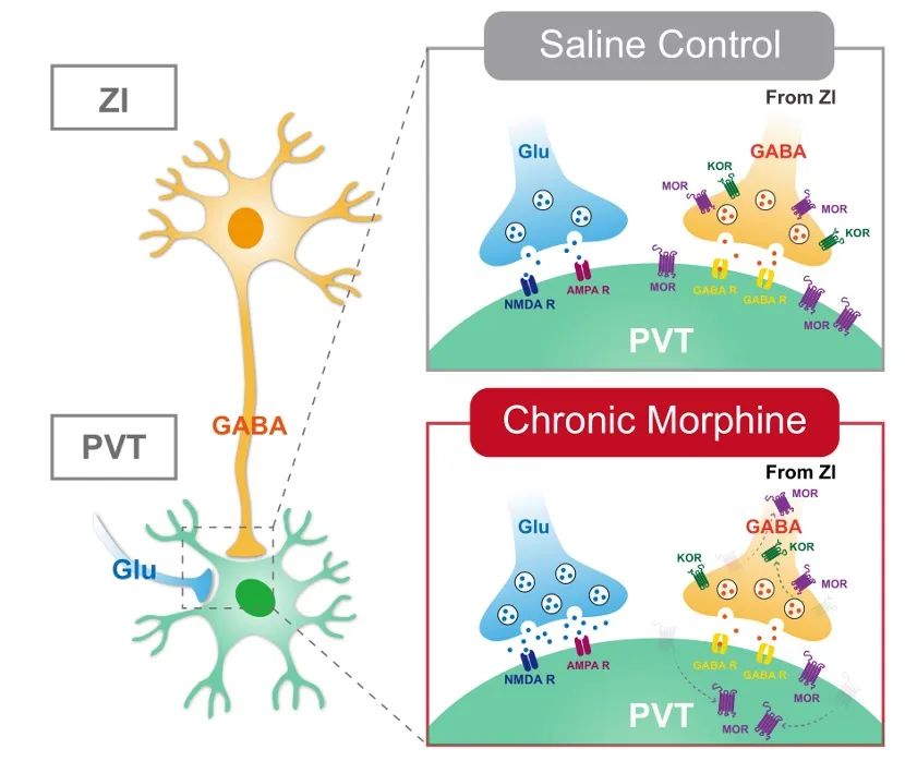 研究者們進一步利用環(huán)路示蹤和光遺傳學實驗,證實了未定帶腦區(qū)(ZI)提供抑制性的GABA能輸入給PVT神經(jīng)元,這條神經(jīng)通路受到κ型阿片受體的調(diào)控,并且在長期使用嗎啡后發(fā)生脫敏。而ZI→PVT神經(jīng)環(huán)路在阿片類物質(zhì)依賴中的具體作用,還有待于未來進一步研究。