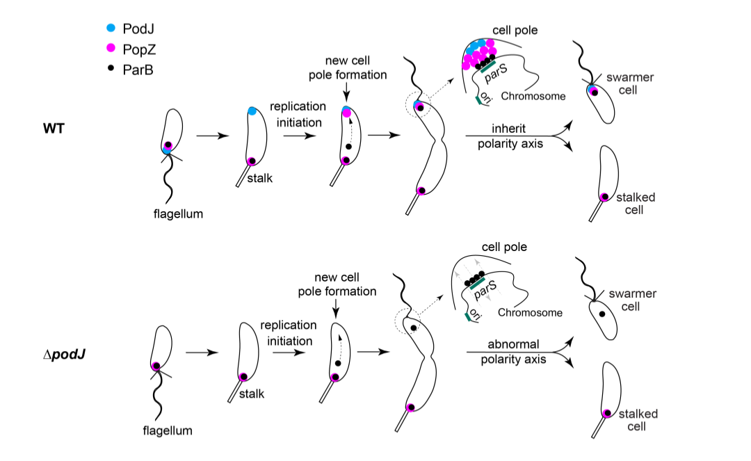 圖2. PodJ-PopZ時空互作調控新月柄桿菌的細胞極性發(fā)育