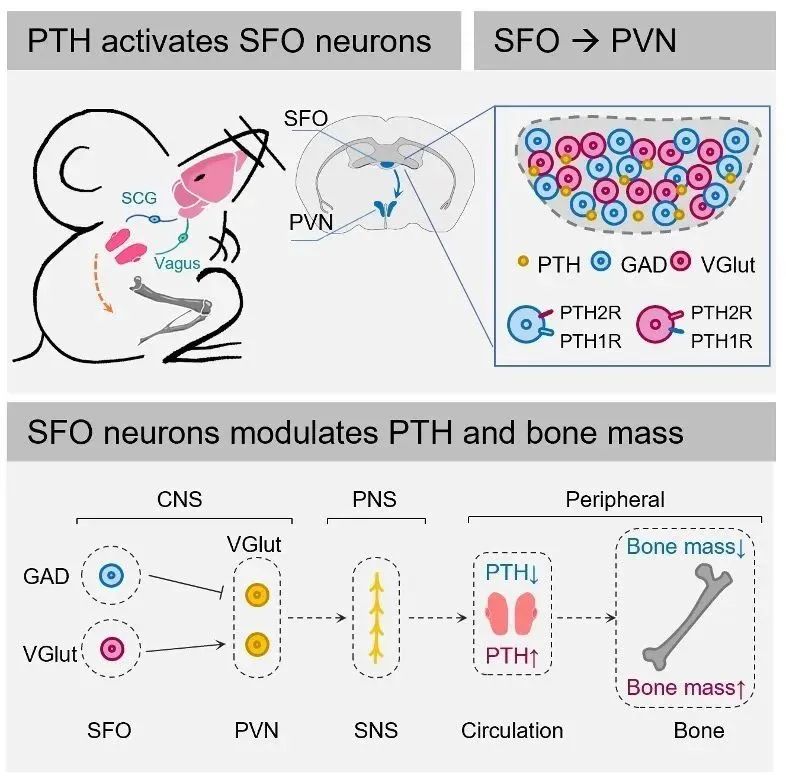 綜上所述,這一研究揭示了中樞SFO腦區(qū)感知外周PTH,分別通過GABA能及Glut能神經(jīng)元以及交感神經(jīng)對PTH水平進行調(diào)節(jié),并進一步調(diào)節(jié)骨代謝的神經(jīng)機制。該機制的發(fā)現(xiàn)首次揭示了大腦-甲狀旁腺-骨軸在維持骨代謝穩(wěn)態(tài)中的關鍵作用,進一步完善了大腦-內(nèi)分泌-骨骼系統(tǒng)互作調(diào)控的學術理論體系,也拓展了精準調(diào)控中樞神經(jīng)干預內(nèi)分泌激素水平的新技術和方法手段,為我們深入理解機體維持骨穩(wěn)態(tài)的機理提供了新的研究思路。