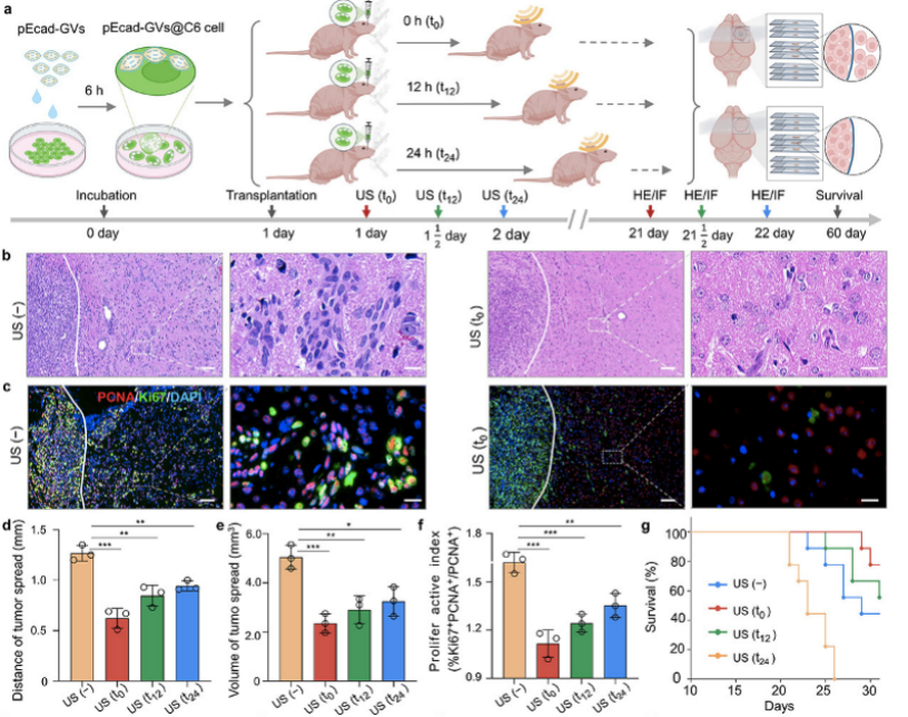 研究團(tuán)隊(duì)利用該系統(tǒng)遞送具有抑制腫瘤轉(zhuǎn)移功能的E-cadherin基因,發(fā)現(xiàn)在C6腦膠質(zhì)瘤細(xì)胞內(nèi)吞載E-cadherin的納泡后,移植到老鼠大腦分別等待0 h (t0),12 h (t12)或24 h (t24)進(jìn)行超聲輻照誘導(dǎo)生物納泡胞內(nèi)空化進(jìn)行基因的核內(nèi)遞送,均能有效抑制腫瘤細(xì)胞的遷移,并能延長(zhǎng)荷瘤鼠的生存期。為了探索超聲胞內(nèi)空化核內(nèi)基因遞送在細(xì)胞周期內(nèi)的應(yīng)用,研究團(tuán)隊(duì)建立了兩種不同的細(xì)胞周期運(yùn)行模式,分別將腫瘤細(xì)胞同步化停留在不同細(xì)胞周期后進(jìn)行超聲基因轉(zhuǎn)染和同步化細(xì)胞撤掉細(xì)胞周期阻滯劑進(jìn)入到不同細(xì)胞周期后接受超聲基因轉(zhuǎn)染(腫瘤細(xì)胞先行內(nèi)吞載基因納泡)。實(shí)驗(yàn)結(jié)果證實(shí)開(kāi)發(fā)的核內(nèi)基因遞送方法在兩種細(xì)胞周期運(yùn)行模式中的G1期、S期和G2/M期均具有相似的基因轉(zhuǎn)染效率,但在抑制腫瘤細(xì)胞侵襲和轉(zhuǎn)移的功能上卻有所不同,表現(xiàn)為在G2/M期行超聲核內(nèi)基因遞送比G1期和S期具有更好的抗腫瘤侵襲和轉(zhuǎn)移的效果。