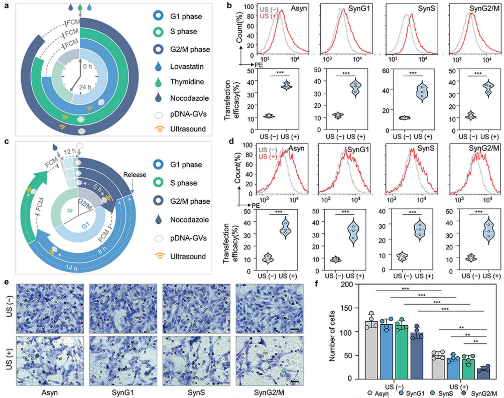 5月8日,中國(guó)科學(xué)院深圳先進(jìn)技術(shù)研究院合成生物學(xué)研究所嚴(yán)飛研究員的最新成果以“Cell-cycle dependent nuclear gene delivery enhances the effects of E-cadherin against tumor invasion and metastasis”為題發(fā)表于國(guó)際知名期刊Signal Transduction and Targeted Therapy。在該項(xiàng)工作中,研究團(tuán)隊(duì)開(kāi)發(fā)了一種新的在體時(shí)空可控核內(nèi)基因遞送的方法,該方法利用生物納泡(Gas vesicles, GVs)作為空化核用于攜載質(zhì)粒DNA,在細(xì)胞內(nèi)吞后借助超聲誘發(fā)載基因生物納泡在胞內(nèi)產(chǎn)生空化效應(yīng),可將質(zhì)粒DNA直接遞送至細(xì)胞核實(shí)現(xiàn)基因的轉(zhuǎn)錄和表達(dá),鑒于超聲具有靶向聚焦的特性以及生物納泡天然的生物相容性能在細(xì)胞內(nèi)長(zhǎng)時(shí)間保持,由此可實(shí)現(xiàn)基因時(shí)空可控地核內(nèi)基因遞送。通過(guò)以抑制腫瘤轉(zhuǎn)移功能的E-cadherin基因作為例子,研究團(tuán)隊(duì)利用開(kāi)發(fā)的胞內(nèi)空化核內(nèi)基因遞送方法證明了可實(shí)現(xiàn)不同時(shí)間維度上控制基因的遞送與表達(dá),并能發(fā)揮抑制腫瘤侵襲和轉(zhuǎn)移的作用。利用該方法團(tuán)隊(duì)比較了在不同細(xì)胞周期遞送E-cadherin基因,發(fā)現(xiàn)在腫瘤細(xì)胞的G2/M期控制外源基因E-cadherin的核內(nèi)遞送與表達(dá)比在G1期和S期能更有效地抑制腫瘤侵襲和轉(zhuǎn)移,進(jìn)一步的分子機(jī)制研究發(fā)現(xiàn)Fam50a/Runx2-MMP13信號(hào)軸在這效應(yīng)增強(qiáng)過(guò)程中發(fā)揮了重要的作用。