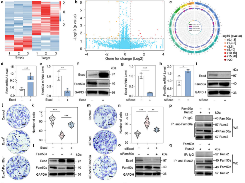 為了進(jìn)一步挖掘超聲胞內(nèi)空化遞送E-cadherin在G2/M期具有更好抑制腫瘤轉(zhuǎn)移的機(jī)制,研究團(tuán)隊(duì)通過(guò)轉(zhuǎn)錄組測(cè)序、qPCR、WB和CO-IP等分子實(shí)驗(yàn),發(fā)現(xiàn)在腫瘤細(xì)胞G2/M期過(guò)表達(dá)E-cadherin會(huì)導(dǎo)致Fam50a基因的下調(diào),進(jìn)而減少Fam50a/Runx2的相互作用及其轉(zhuǎn)錄激活功能,最終導(dǎo)致MMP13的下調(diào),揭示了超聲胞內(nèi)空化核內(nèi)遞送E-cadherin基因在細(xì)胞周期G2/M期發(fā)揮更好抑制腫瘤轉(zhuǎn)移的機(jī)制。
