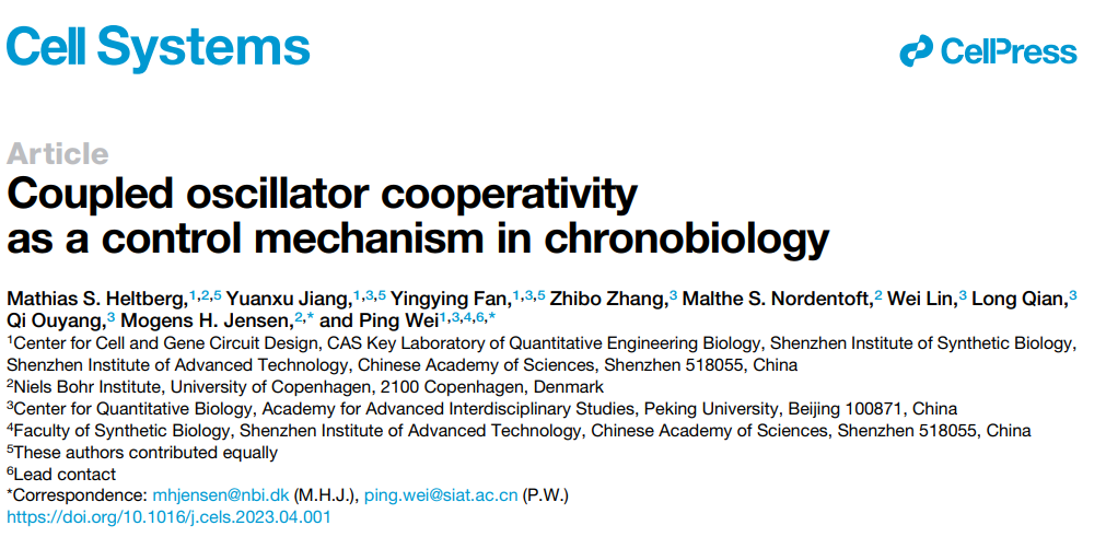 2023年5月17日,中國科學院深圳先進技術研究院合成生物學研究所細胞與基因線路設計中心魏平課題組與丹麥皇家科學院院長Mogens H. Jensen課題組合作在Cell Systems上發(fā)表研究論文“Coupled oscillator cooperativity as a control mechanism in chronobiology”,通過合成生物學方法構建了一種三元耦合振蕩系統(tǒng),并結合數(shù)學模型,首次深入地探討了生命系統(tǒng)中多重耦合振蕩系統(tǒng)中的調(diào)控機理。