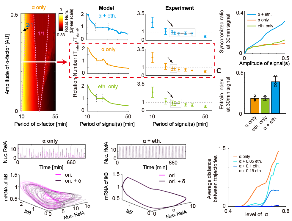 基于這一系統(tǒng)結合數(shù)學模型,作者發(fā)現(xiàn),雙重周期信號同時存在能夠顯著地提高內(nèi)外振蕩同步化的范圍、降低細胞群體振蕩動力學的差異、提高同步化細胞在群體中所占的比例。模型模擬結果更表明,雙輸入條件能夠推遲混沌的發(fā)生。這些結果說明了外界兩種周期信號對系統(tǒng)的作用并不是簡單的線性疊加,而是以一種相互協(xié)同的形式產(chǎn)生作用。