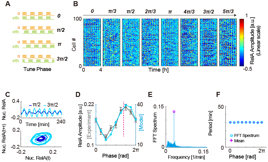 進一步,作者注意到調(diào)整外界信號間的相位差能夠非常明顯地改變內(nèi)部振蕩的振幅,而保持內(nèi)部振蕩周期不變,從而實現(xiàn)理論上嚴格的“調(diào)幅不調(diào)頻”。深入探究表明,帶來最大振幅的信號相位組合與內(nèi)部系統(tǒng)的動力學參數(shù)之間存在高度相關性。為了驗證以上結論的普適性,作者還選取了三個不同的振蕩系統(tǒng)進行數(shù)值模擬。在范德波爾振子、p53振蕩系統(tǒng)和天然NF-κB振蕩系統(tǒng)中,以上結論均得到很好的重復。