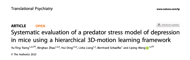 近日,中國科學(xué)院深圳先進技術(shù)研究院/深港腦科學(xué)創(chuàng)新研究院王立平團隊在Nature子刊Translational Psychiatry雜志在線發(fā)表了題為“Systematic evaluation of a predator stress model of depression in mice using a hierarchical 3D-motion learning framework ”的研究論文[1],利用實驗室自主研發(fā)的AI三維精細(xì)動物自發(fā)行為分析系統(tǒng)建立長期天敵壓力及同類社交壓力下動物自發(fā)行為圖譜,對不同壓力應(yīng)激源下抑郁模型小鼠的自發(fā)行為進行評估。研究揭示天敵壓力模型可以在兩性誘導(dǎo)經(jīng)典抑郁樣行為及自發(fā)行為的改變,基于動物自發(fā)行為可以區(qū)分不同壓力應(yīng)激源,并且建立了預(yù)測模型發(fā)現(xiàn)利用自發(fā)行為可以較好地預(yù)測部分抑郁樣行為,對動物抑郁狀態(tài)進行評估,而抗抑郁藥物氟西汀顯著逆轉(zhuǎn)了抑郁模型小鼠自發(fā)行為特征的變化。這是繼去年年團隊在Neuron發(fā)文揭示天敵壓力下快速眼動睡眠參與本能恐懼反應(yīng)的神經(jīng)機制研究成果后[2],在本能恐懼行為解析方面的又一重要進展。這一研究提示基于AI的精細(xì)自發(fā)行為分析為神經(jīng)精神疾病研究提供了一種客觀的、全面且精細(xì)的評價方法,有望應(yīng)用于抑郁障礙等精神疾病的系統(tǒng)評估、機制研究和藥物篩選。