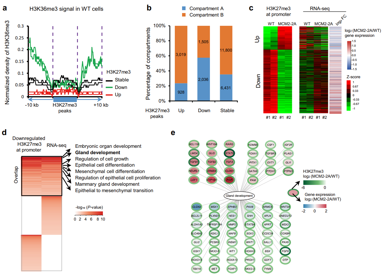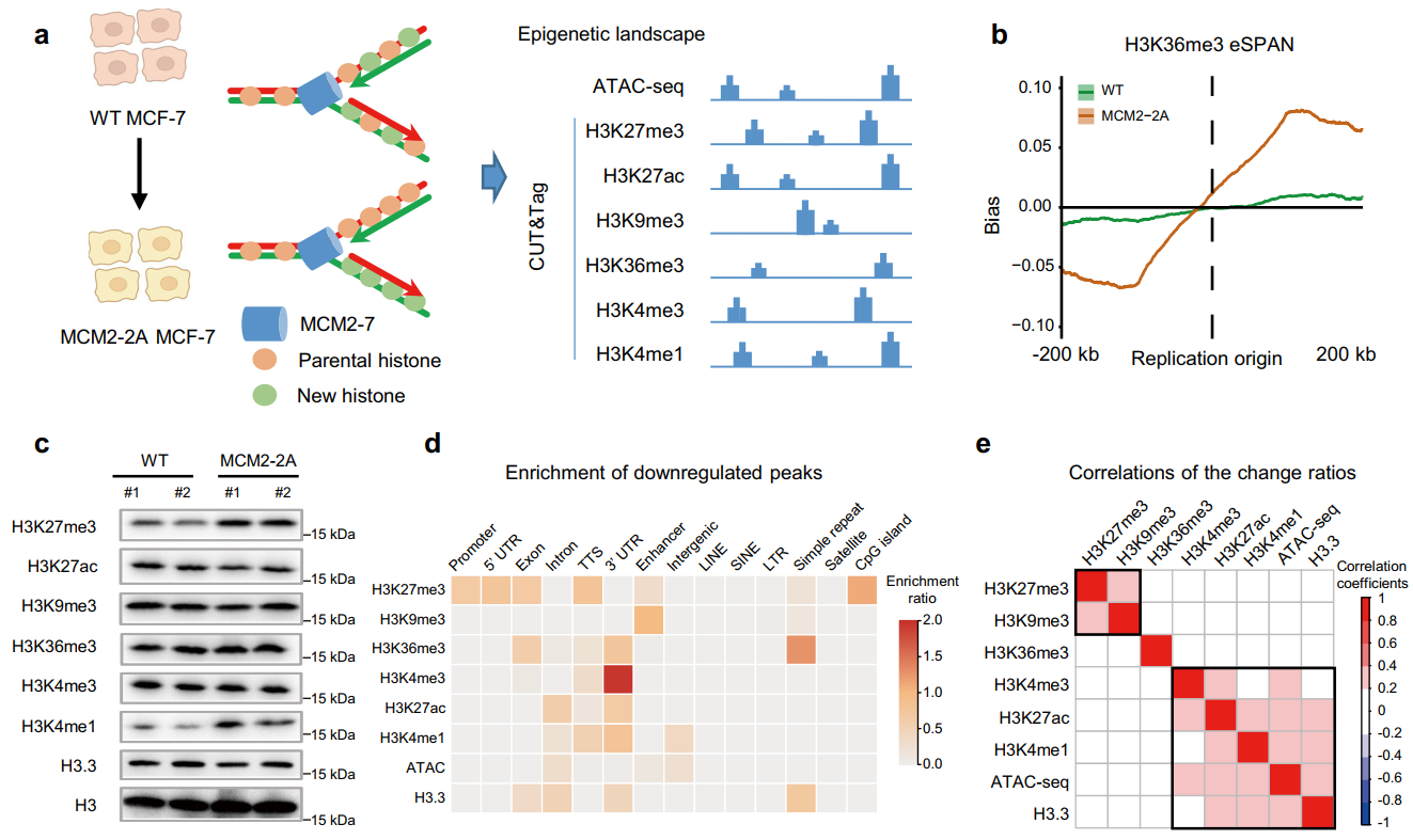 為了深入探討組蛋白遺傳在腫瘤進(jìn)展中的作用,甘海云團(tuán)隊(duì)在人類乳腺癌細(xì)胞中通過突變MCM2與組蛋白結(jié)合的結(jié)構(gòu)域或敲除POLE3成功構(gòu)建了組蛋白遺傳受損的腫瘤細(xì)胞模型,并發(fā)現(xiàn)破壞腫瘤細(xì)胞的組蛋白遺傳后,腫瘤細(xì)胞的表觀遺傳譜發(fā)生了劇烈的改變(圖1)。