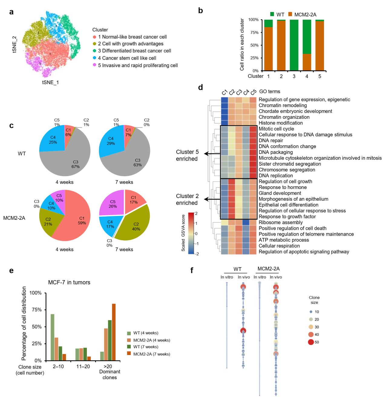 研究團(tuán)隊(duì)將組蛋白遺傳受損的乳腺癌細(xì)胞原位植入小鼠乳腺,發(fā)現(xiàn)其生長(zhǎng)顯著增快,侵襲性增強(qiáng),小鼠肺轉(zhuǎn)移明顯增多(圖3)。進(jìn)一步的單細(xì)胞測(cè)序揭示了組蛋白遺傳受損的細(xì)胞在植入體內(nèi)后出現(xiàn)了兩個(gè)新的亞群,這兩個(gè)亞群是導(dǎo)致腫瘤細(xì)胞的快速增殖和侵襲性增強(qiáng)的主要因素。隨后的譜系追蹤結(jié)果顯示,組蛋白遺傳受損后腫瘤細(xì)胞更容易獲得適應(yīng)性優(yōu)勢(shì)從而形成優(yōu)勢(shì)克隆,這些新出現(xiàn)的具有優(yōu)勢(shì)的克隆促進(jìn)了腫瘤細(xì)胞的進(jìn)化(圖4)。