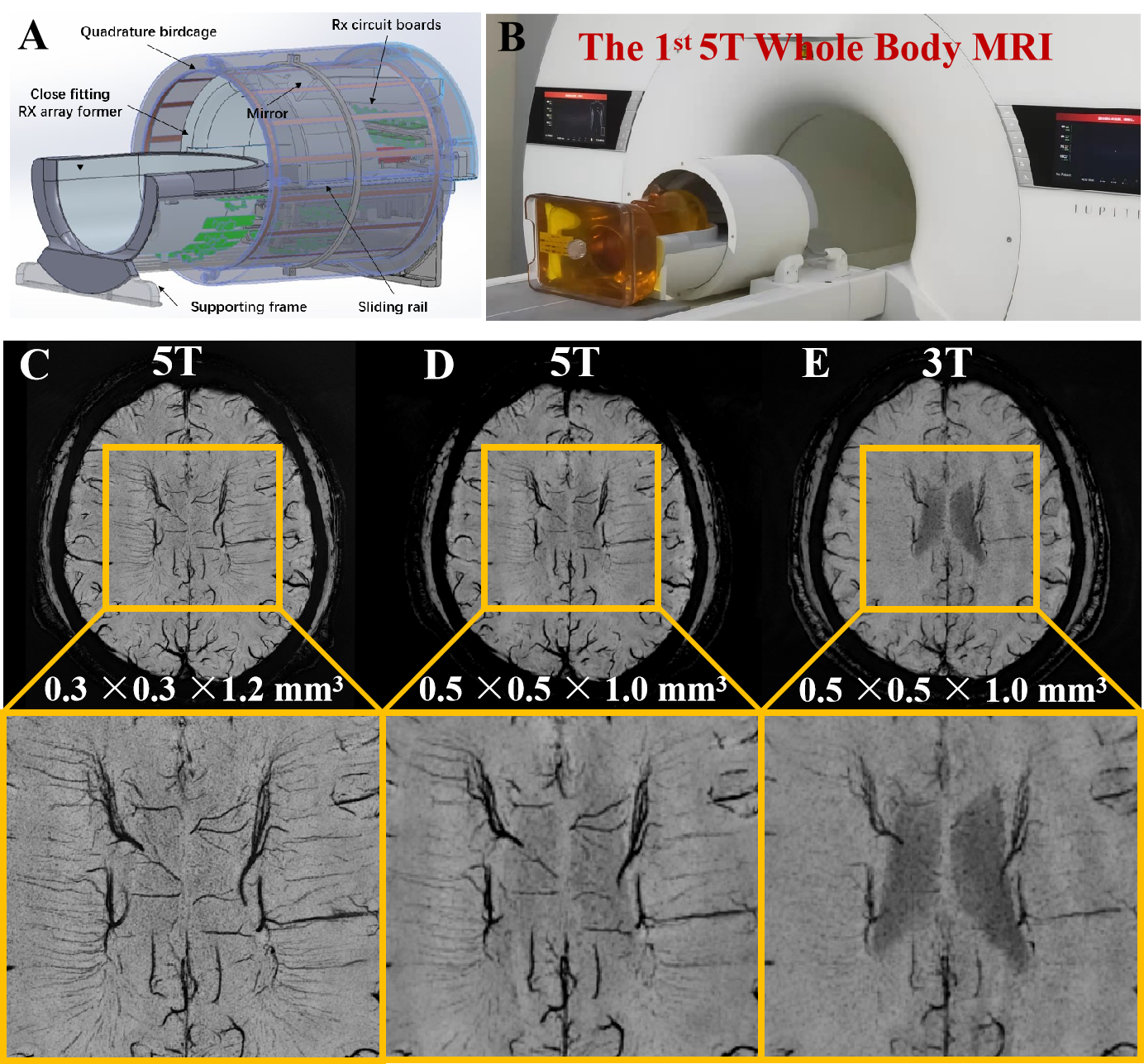圖1 5T系統(tǒng) 48通道線圈頭部收發(fā)一體射頻線圈(A),在國際首創(chuàng)5T系統(tǒng)(B)上首次實現(xiàn)了采集分辨率為0.3 mm ×0.3 mm ×1.2 mm的高分辨磁敏感加權(quán)成像(C),較3T系統(tǒng)(E)展示如髓靜脈等更豐富的細節(jié)。