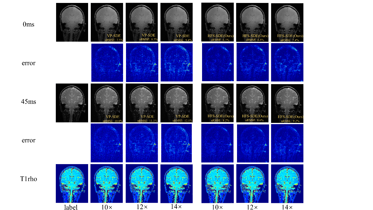 在超高場功能磁共振T1ρ弛豫定量成像方面,團隊首次在5.0 T磁共振平臺上測試了大腦T1ρ成像的可行性,并比較了使用3.0 T和5.0 T掃描儀所得的T1ρ值。實驗結(jié)果表明,5.0T下獲得了信噪比更高的T1ρ加權(quán)圖像。在高分辨率成像中,5.0T的信噪比優(yōu)勢更明顯。該成果發(fā)表在Frontiers in Physics(2022,10:1016932)。團隊還提出一種用于基于擴散的MR重建方法——HFS-SDE,并將這種新方法應(yīng)用于MR T1ρ映射,實現(xiàn)14倍的高加速度,相對于VP-SDE的高速倍數(shù)下沒有顯示偽影,nRMSE值明顯優(yōu)于VP-SDE,并且圖像的高頻細節(jié)得到了更好的重建,該成果“Diffusion generative prior-based highly accelerated MR T1ρ mapping”在2023 ISMRM會議被收錄為Power Pitch。