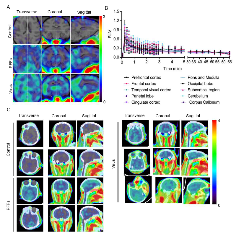 在進(jìn)一步的驗(yàn)證實(shí)驗(yàn)中,葉克強(qiáng)團(tuán)隊(duì)鑒定了這種新型的苯并噻唑-乙烯基-苯酚衍生物(F0502B),與α-Syn纖維的特異性結(jié)合高于Aβ和Tau纖維,并且能夠選擇性標(biāo)記人體PD樣本中的α-Syn聚集物。此外,恒河猴PD模型體內(nèi)PET顯像顯示[18F]-F0502B能特異性識(shí)別其體內(nèi)的α-Syn聚集物。而且,在兩種非人靈長(zhǎng)類(lèi)PD模型中,聚集的α-Syn水平可能隨著時(shí)間的推移而增加,導(dǎo)致PET特異性結(jié)合信號(hào)的升高。