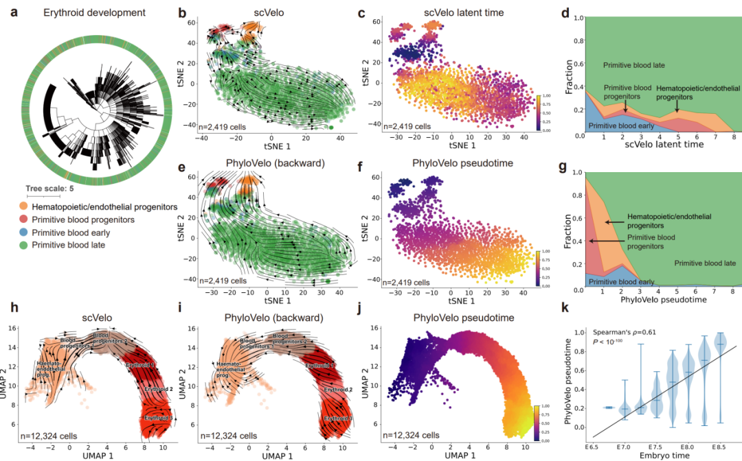 作者在多種仿真數(shù)據(jù)和真實(shí)數(shù)據(jù)上對(duì)PhyloVelo算法的準(zhǔn)確性和魯棒性進(jìn)行了驗(yàn)證,PhyloVelo都能夠高準(zhǔn)確地推斷仿真數(shù)據(jù)中的線(xiàn)性、分叉和趨同等復(fù)雜分化結(jié)構(gòu),與真實(shí)分化軌跡高度一致(圖2)。此外,PhyloVelo還在小鼠早期胚胎發(fā)育中表現(xiàn)出優(yōu)于RNA velocity的性能,能夠準(zhǔn)確地識(shí)別出紅細(xì)胞系列中血液/內(nèi)皮祖細(xì)胞作為最早期的細(xì)胞類(lèi)型,并且與細(xì)胞增殖能力呈強(qiáng)相關(guān)(圖3)。