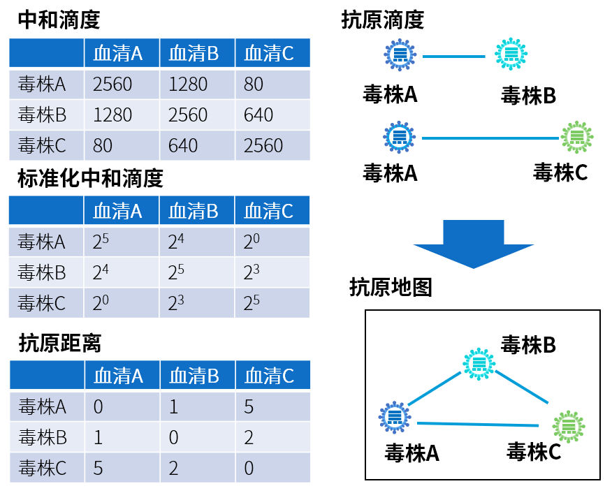 研究者首先根據(jù)已有的中和數(shù)據(jù)和測(cè)序數(shù)據(jù)進(jìn)定量建模,構(gòu)建了“抗原距離”模型用來(lái)衡量不同突變株之間的免疫逃逸。針對(duì)不同毒株的抗原,人體會(huì)產(chǎn)生不同的血清;反之,人體在中和不同毒株時(shí),其中和能力也有不同。通過(guò)不同血清和不同的毒株的交叉中和,可以最終測(cè)定處不同的毒株之間的抗原距離,并通過(guò)數(shù)據(jù)降維繪制抗原地圖(圖1)。
