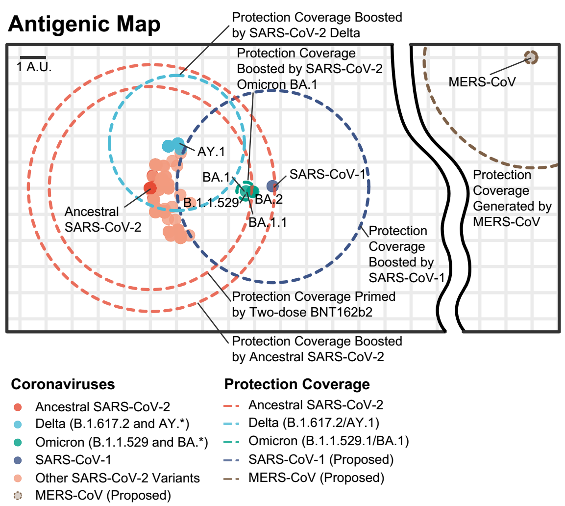 通過(guò)這一工具,研究者繪制了新冠的抗原地圖,并預(yù)測(cè)了采用不同毒株的作為免疫加強(qiáng)針的保護(hù)范圍,包括了新冠始祖毒株(Ancestral SARS-CoV-2)、新冠德?tīng)査局辏⊿ARS-CoV-2 Delta,B.1.617.2/AY.1)、新冠奧密克戎毒株(SARS-CoV-2 Omicron,B.1.1.529/BA.1)、非典冠狀病毒(SARS-CoV-1)和中東呼吸綜合征冠狀病毒(MERS-CoV)在內(nèi)的候選毒株。模型結(jié)果顯示,非典冠狀病毒(SARS-CoV-1)作為疫苗株有望提供更廣的保護(hù)力范圍。而德?tīng)査局辏?/font>SARS-CoV-2 Delta,B.1.617.2/AY.1)作為疫苗株雖然不及非典冠狀病毒(SARS-CoV-1)的效果,但仍優(yōu)于新冠奧密克戎毒株(SARS-CoV-2 Omicron,B.1.1.529/BA.1)。