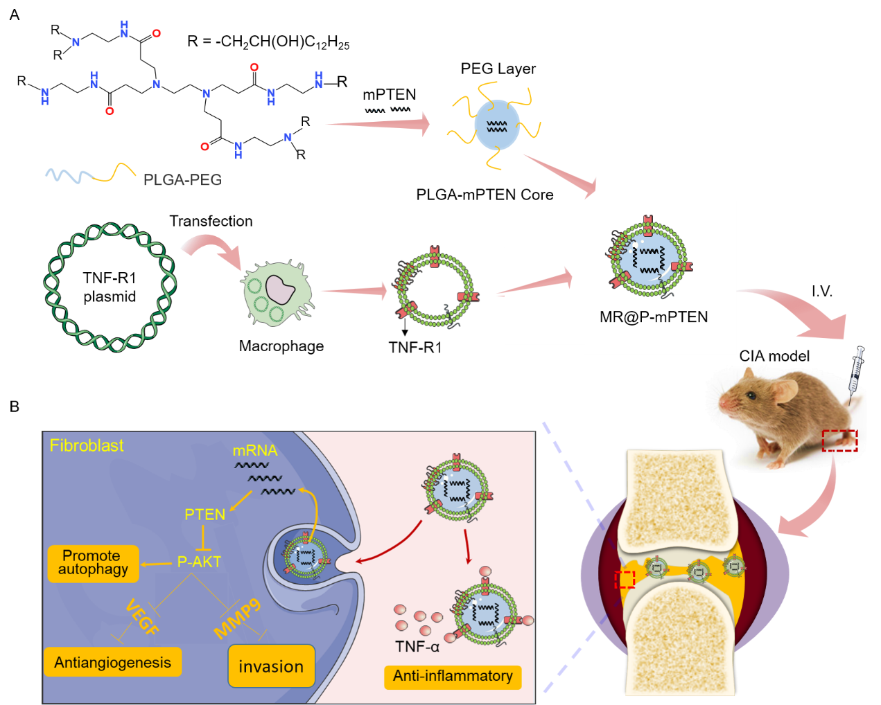 圖1.MR@P-mPTEN的合成和治療CIA機(jī)制。(A)MR@P-mPTEN的合成示意圖。(B)MR@P-mPTEN治療CIA的機(jī)制。MR@P-mPTEN競(jìng)爭(zhēng)性結(jié)合TNF-α,然后將mPTEN導(dǎo)入滑膜成纖維細(xì)胞,誘導(dǎo)細(xì)胞表達(dá)PTEN蛋白。PTEN能夠抑制P-AKT的表達(dá),抑制成纖維細(xì)胞的侵襲、遷移、血管生成和自噬。