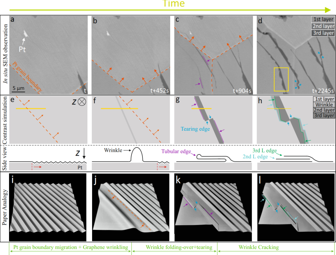 圖1:石墨烯折紙現(xiàn)象的記錄與演示,其中(a-d)原位ESEM實驗所記錄的褶皺形成、倒下和再生長的過程;(e-h)相應過程的示意圖;(i-l)利用折紙模型演示褶皺的形成、倒下和再生長。