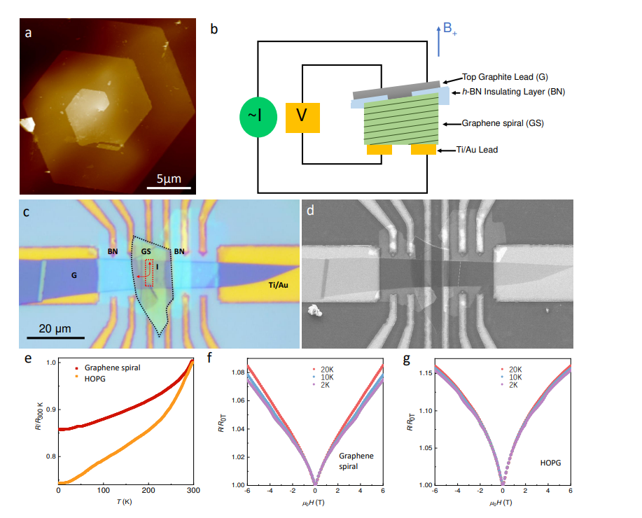 圖4:多層螺旋石墨烯和多層堆垛石墨輸運性質(zhì)的區(qū)別,(a)原子力顯微鏡觀察到的螺旋位錯中心;(b-d)輸運性質(zhì)檢測時的實驗設置;(e-g)多層螺旋石墨烯和多層堆垛石墨的電阻和磁阻隨溫度變化的關系。