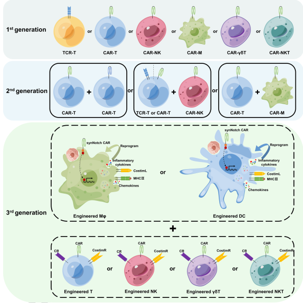 癌癥是人類健康的“頭號(hào)殺手”,每年奪取近千萬人的生命。近年來,過繼細(xì)胞療法(Adoptive Cell Therapy, ACT),特別是CAR-T療法,已經(jīng)徹底改變了癌癥治療格局,因而備受學(xué)術(shù)界專業(yè)人士和社會(huì)媒體的關(guān)注。與傳統(tǒng)的化療藥物不同,ACT是一種使用“活藥”的生物治療策略:病人的免疫細(xì)胞被收集,擴(kuò)增并在體外進(jìn)行工程改造,然后重新注入患者體內(nèi);這些被改造的免疫細(xì)胞就像是訓(xùn)練有素的特種兵,可以在體內(nèi)長(zhǎng)時(shí)間追蹤、殺傷癌細(xì)胞。截至目前,已經(jīng)有8款CAR-T細(xì)胞療法獲批用于血液系統(tǒng)惡性腫瘤的治療,取得了革命性的突破。盡管如此,CAR-T細(xì)胞療法對(duì)實(shí)體瘤的治療效果卻未能讓人滿意,因此,在實(shí)體瘤治療研究領(lǐng)域,其他ACT,比如TIL、TCR-T、CAR-NK、CAR-M、CAR-γδT和CAR-NKT療法,由于它們獨(dú)有的一些優(yōu)勢(shì)而備受關(guān)注,目前正被廣泛的研究和開發(fā)利用(圖1),獲得了一些積極的成果。