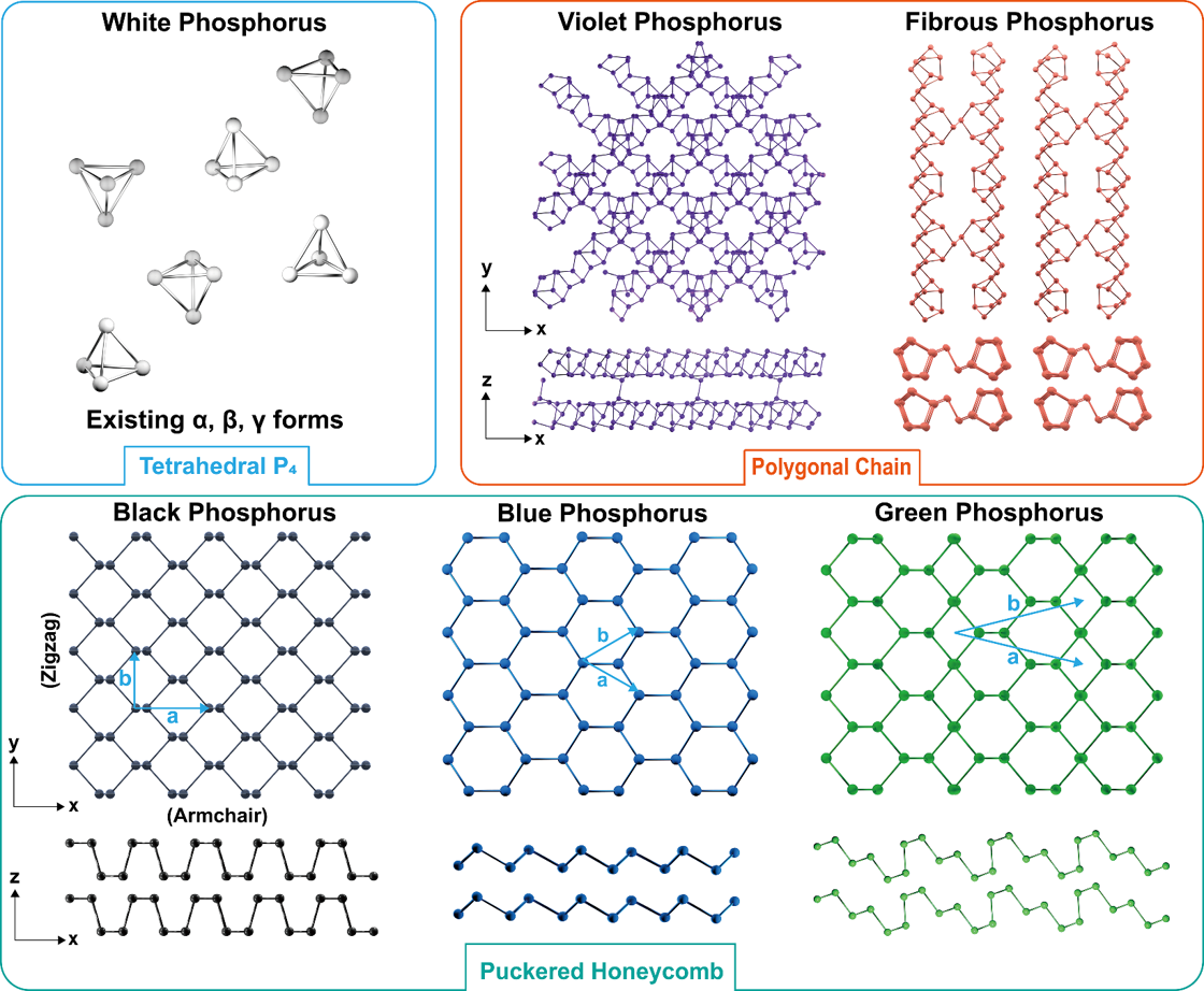 單質(zhì)磷材料(Elemental Phosphorus Materials, EPMs)獨(dú)特的多態(tài)性使其在物質(zhì)科學(xué)領(lǐng)域受到越來越多的關(guān)注。本綜述從磷元素的發(fā)現(xiàn)、到歷史上各單質(zhì)磷結(jié)構(gòu)的測(cè)定、再到近期基于機(jī)器學(xué)習(xí)的結(jié)構(gòu)搜索,系統(tǒng)回顧了單質(zhì)磷材料的發(fā)現(xiàn)過程。對(duì)白磷、黑磷、非晶紅磷、藍(lán)磷、紫磷和纖維磷等代表性單質(zhì)磷材料迥異的原子結(jié)構(gòu)、豐富的電聲子性質(zhì)、多變的氧化還原活性和穩(wěn)定性等進(jìn)行了總結(jié)。從理論和實(shí)驗(yàn)的角度分析了這些理化特性的結(jié)構(gòu)起源,并詳細(xì)討論了各種單質(zhì)磷材料之間的共性與差異(圖2)。