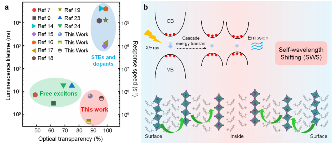 圖1. 鈣鈦礦閃爍體發(fā)光性能總結和自移波示意圖