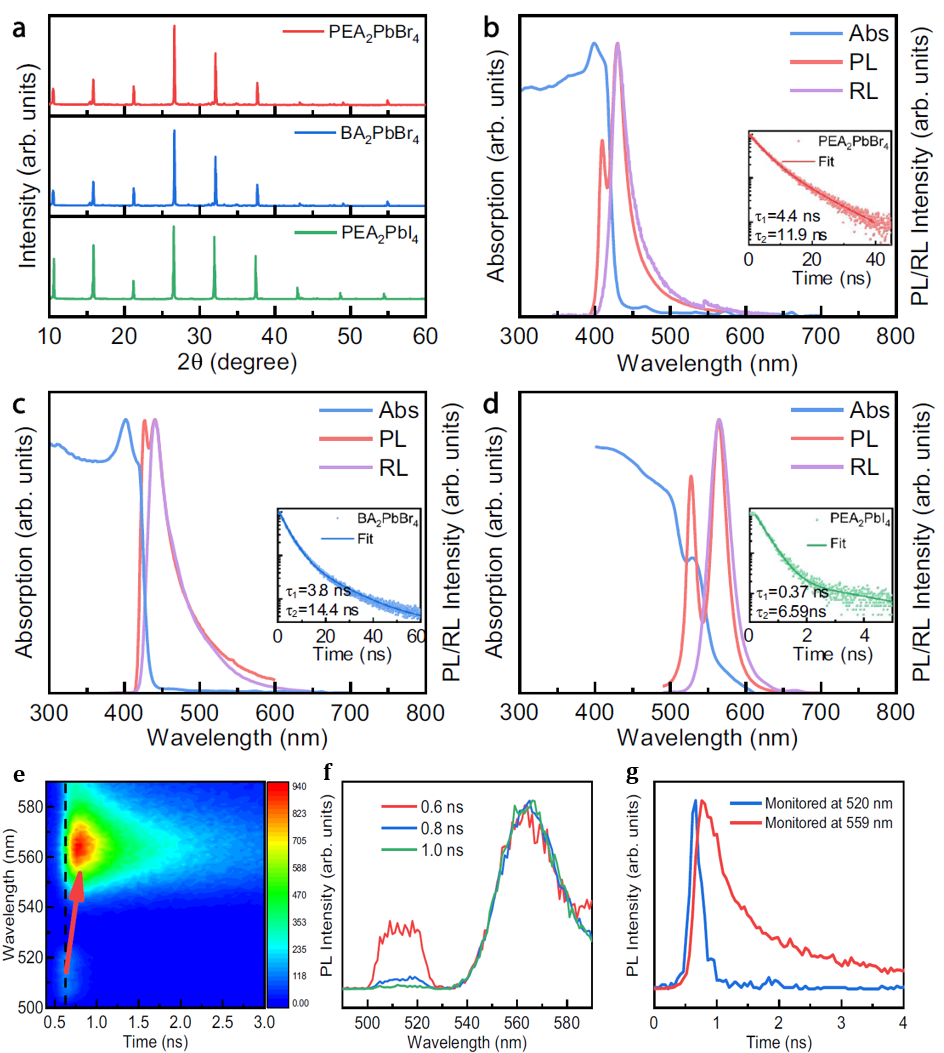在以往的研究當中,研究人員嘗試采用限域激子發(fā)光和摻雜劑等策略來解決自吸收問題。然而,這些方法在抑制自吸收的同時,卻導致了發(fā)光壽命的延長。近日,中國科學院深圳先進技術研究院醫(yī)學成像科學與技術系統(tǒng)重點實驗室團隊和華中科技大學光電子器件與三維集成團隊在該領域共同合作,此次的最新研究發(fā)現(xiàn),二維鈣鈦礦晶體中普遍存在的內在應變現(xiàn)象,可以顯著減少自吸收效應,而不影響發(fā)光壽命。這一發(fā)現(xiàn)為高能γ射線探測和PET成像提供了全新的思路,這項研究成果于近期在Nature Communications雜志在線刊發(fā)。此論文題目為Self-wavelength Shifting in Two-dimensional Perovskite for Sensitive and Fast Gamma-ray Detection,論文第一作者為金童、柳正和羅家俊,牛廣達和薛堪豪為本文通訊作者。
