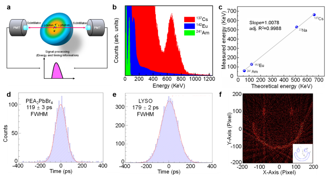 基于這一發(fā)現(xiàn),材料研究人員與醫(yī)學成像團隊展開了卓有成效的合作,成功將具有“自移波”特性的二維鈣鈦礦閃爍體應用于高能γ射線探測,首次實現(xiàn)了該閃爍體在正電子發(fā)射斷層掃描PET圖像的精確重建。這一研究不僅為γ射線快響應材料的探索提供了新的思路,還為新材料高時間分辨率PET探測器的發(fā)展提供了有力支持。此外,它也為無需依賴傳統(tǒng)斷層掃描重建的PET直接成像提供了有價值的研究方向。