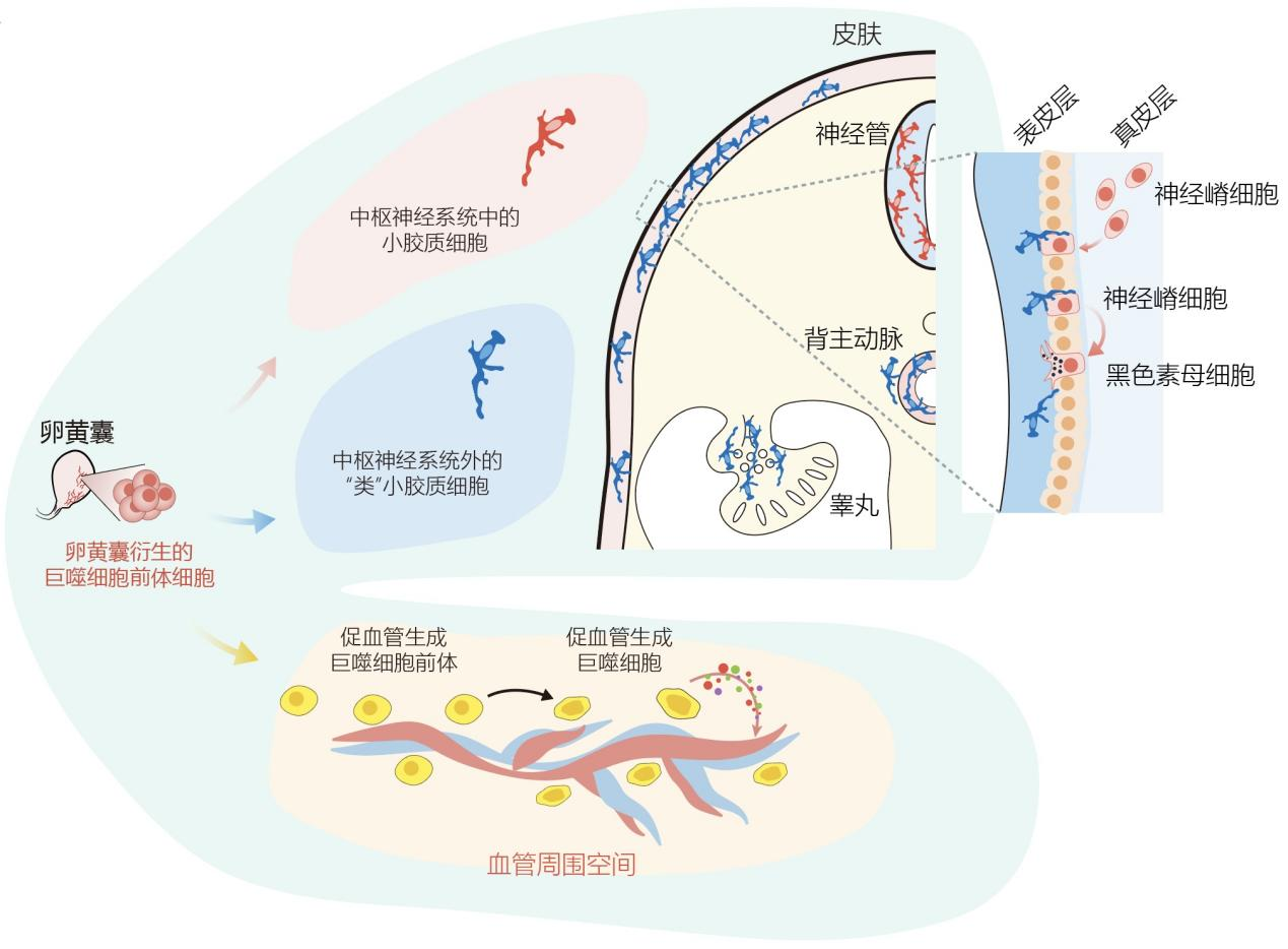圖2 巨噬細(xì)胞前體分化為小膠質(zhì)細(xì)胞/類小膠質(zhì)細(xì)胞和促血管生成巨噬細(xì)胞;類小膠質(zhì)細(xì)胞在表皮與神經(jīng)嵴細(xì)胞互作,并調(diào)控其分化